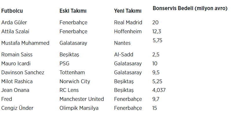 Hisseleri Borsa İstanbul'da işlem gören kulüplerin Kamu Aydınlatma Platformu'na (KAP) yaptıkları bildirimlere göre, Fenerbahçe Arda Güler'in Real Madrid'e 20 milyon avro bonservis bedeli ile transfer olduğu açıkladı. Attila Szalai'nin de 12,3 milyon avro sözleşme fesih bedeliyle Hoffenheim'a transfer olduğu duyuruldu.