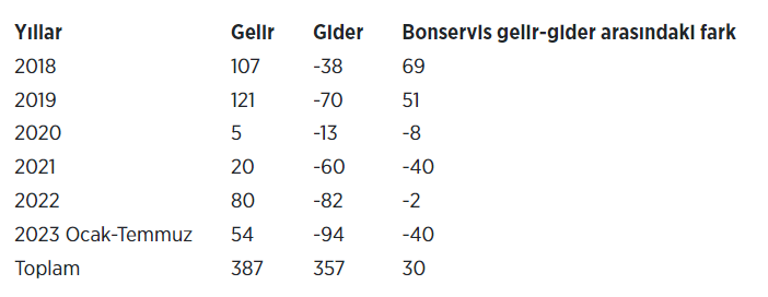 TCMB verilerine göre 2018-2023 Temmuz döneminde yurt dışı net bonservis gelir gider dengesi (milyon dolar) şöyle: