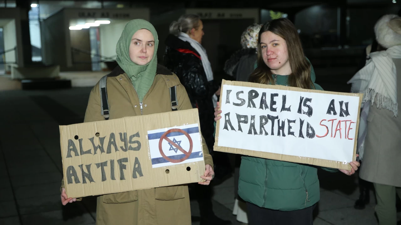 İsrail'in Gazze'ye saldırılarını protesto edenler, Bosna Hersek Kadın Buz Hokeyi Milli Takımı ile İsrail Kadın Buz Hokeyi Milli Takımı'nın Saraybosna'daki İskenderiye Kültür ve Spor Merkezi'nde oynayacağı maç öncesi spor salonu önünde toplandı.