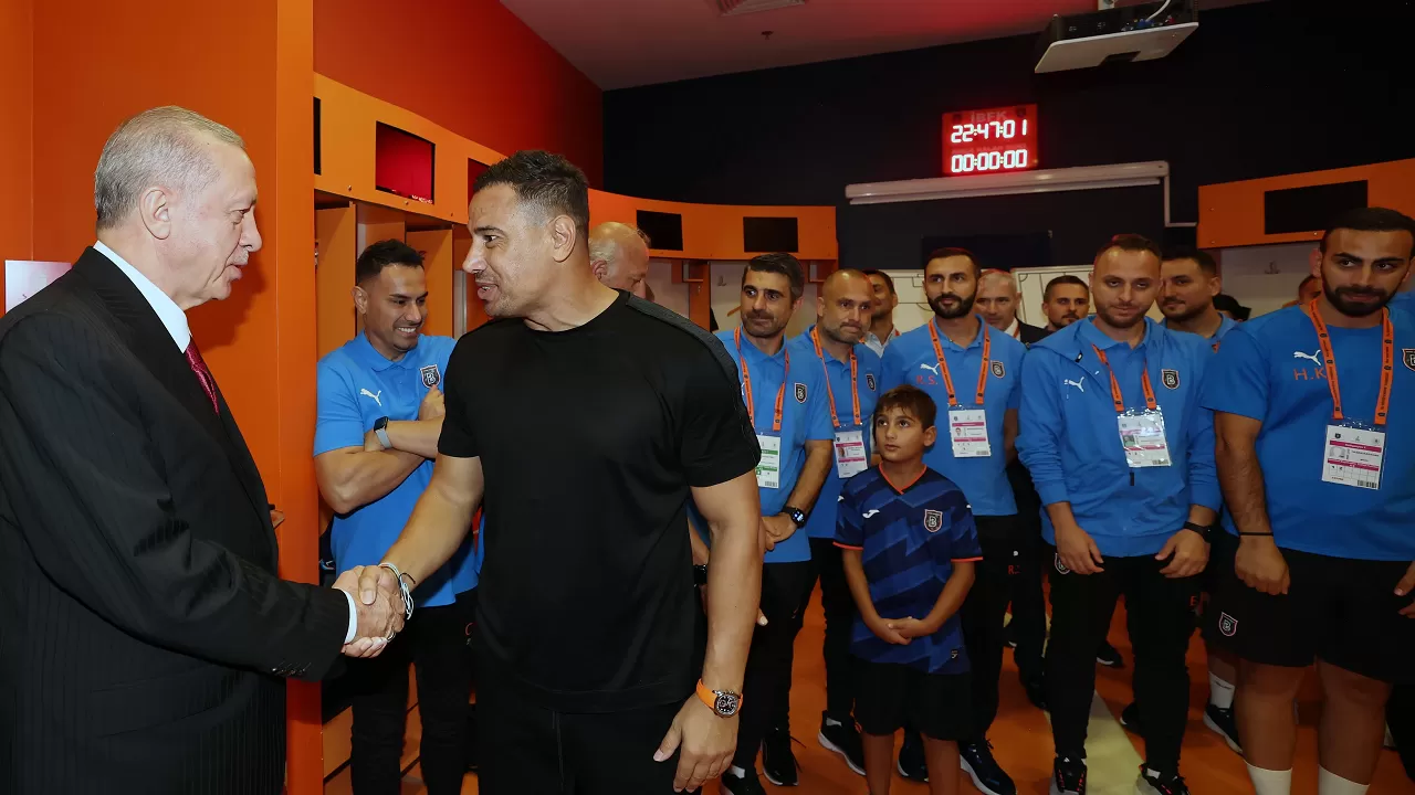 Cumhurbaşkanı Recep Tayyip Erdoğan, Başakşehir'in, La Fiorita'yı 6-1'lik skorla mağlup ettiği maçın ardından soyunma odasında teknik ekibi ve futbolcuları tebrik etti.