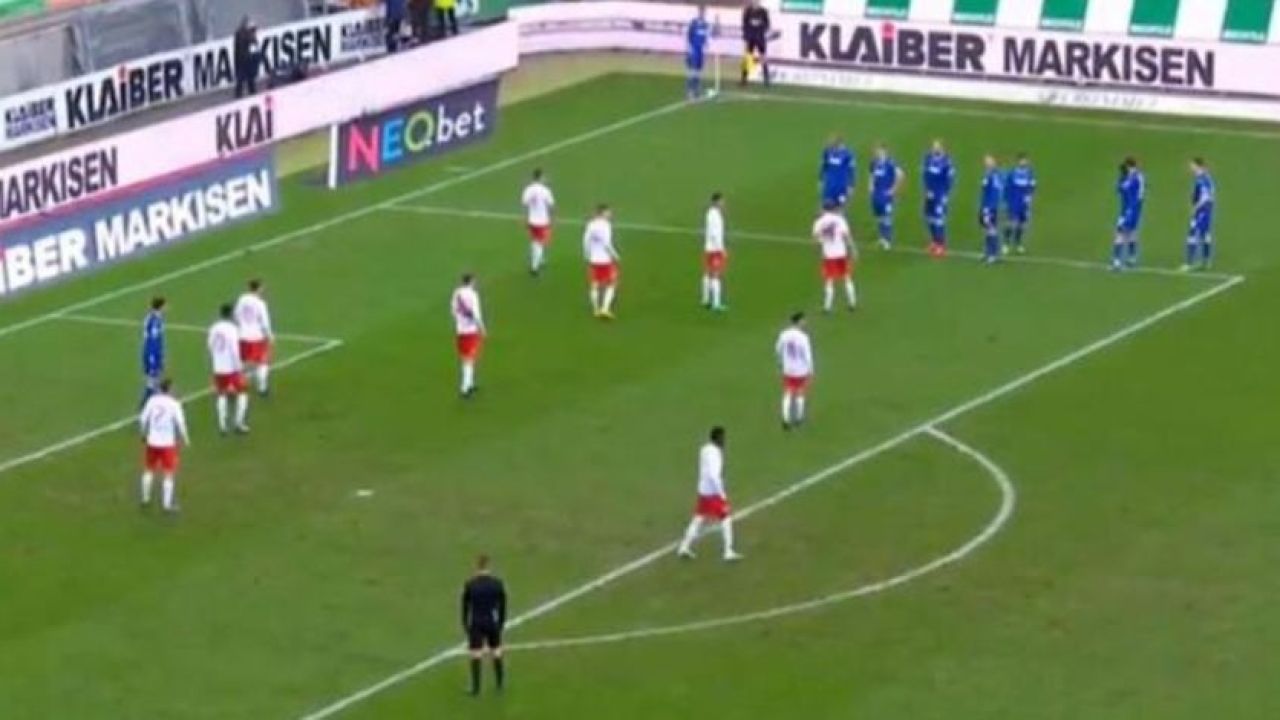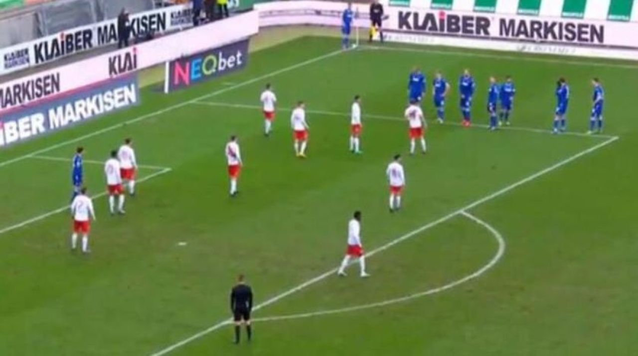 Ev sahibi ekip sağ taraftan korner kullanacağı sırada takım oyuncuları ilginç bir diziliş yaptı. Sadece bir oyuncuyu altı pas içerisinde gönderen Karlsruhe ekibi, altı futbolcuyu kornerin kullanılacağı köşeye en yakın ceza sahası çizgisi etrafında topladı.