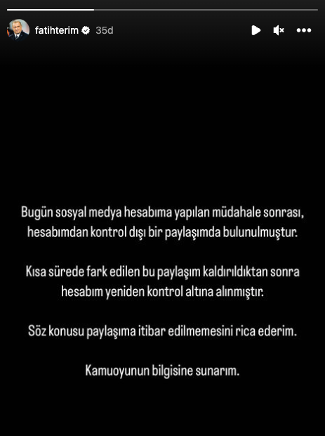 Öte yandan Fatih Terim kısa süre içinde hesabını geri aldı. Başarılı hoca yaptığı paylaşımda "Bugün sosyal medya hesabıma yapılan müdahale sonrası, hesabımdan kontrol dışı bir paylaşımda bulunulmuştur. Kısa sürede fark edilen bu paylaşım kaldırıldıktan sonra hesabım yeniden kontrol altına alınmıştır. Söz konusu paylaşıma itibar edilmemesini rica ederim" ifadeleri kullanıldı.