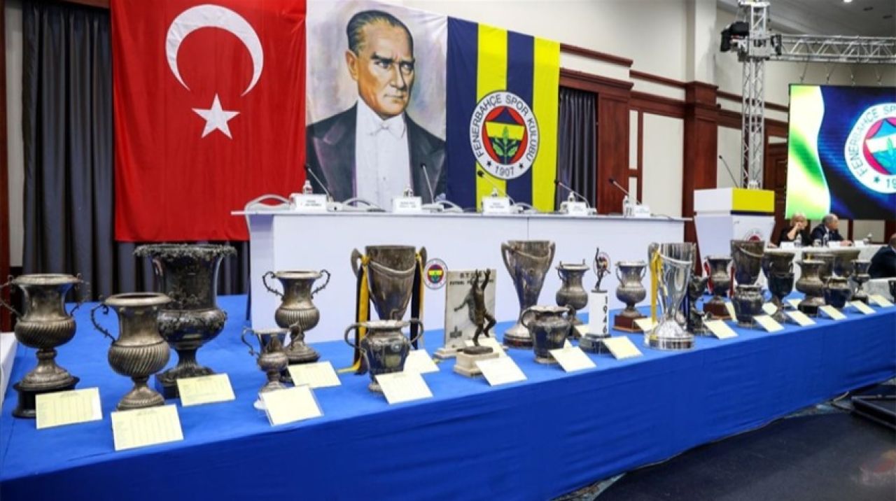 Toplantı salonundaki konuşma kürsüsünün önünde Fenerbahçe'nin tarihi boyunca futbolda kazandığı şampiyonluk kupaları sergilendi.