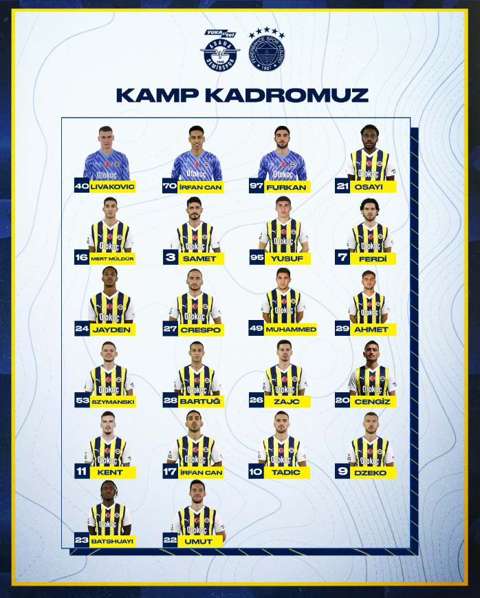 Fenerbahçe, Trendyol Süper Lig'in 12. haftasında yarın Adana Demirspor'a konuk olacak. Sarı lacivertli ekip, sakatlıkları devam eden ve cezalı durumda olan bazı oyuncularını kadroya dahil etmeyecek.