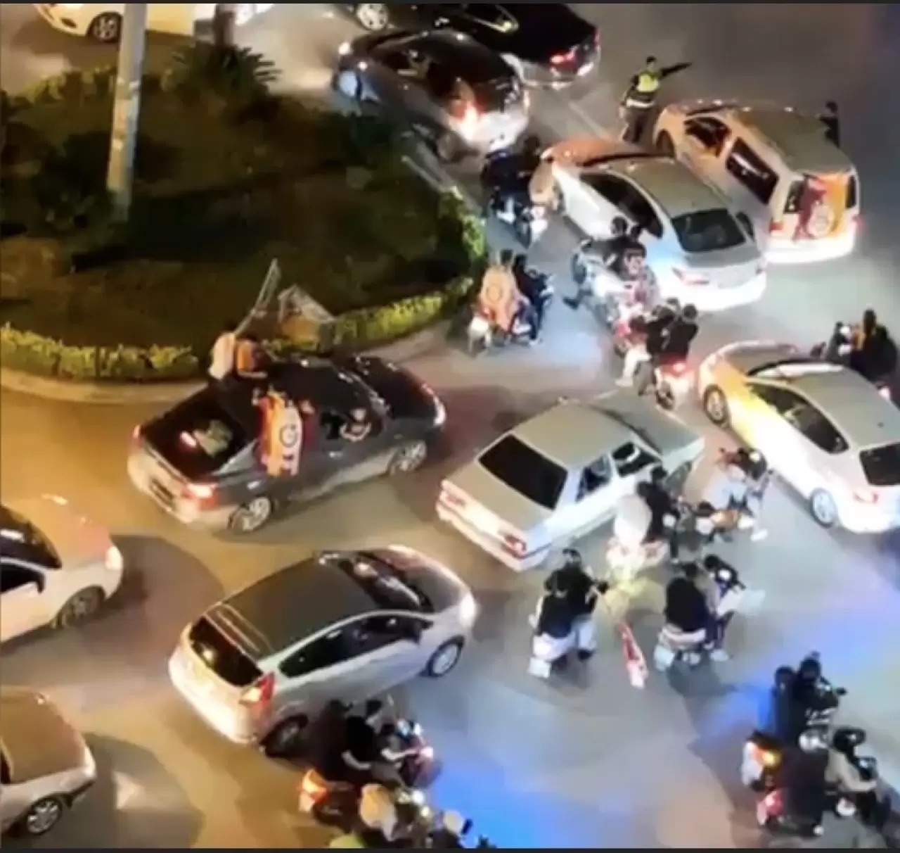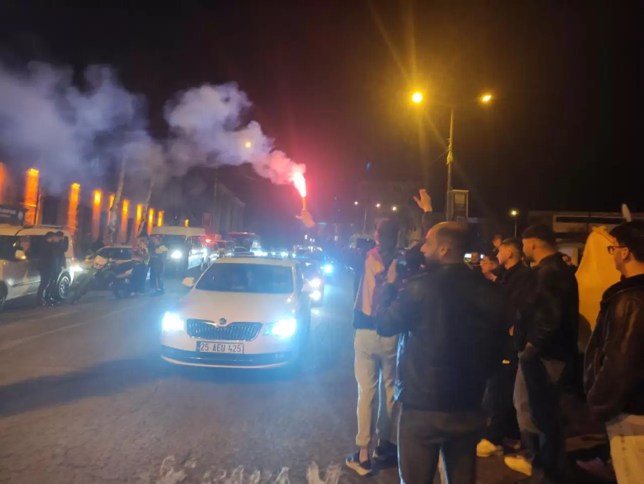 Sarı-kırmızılı taraftarlar, araç konvoyları oluşturarak marşlar söyledi, meşaleler yaktı.