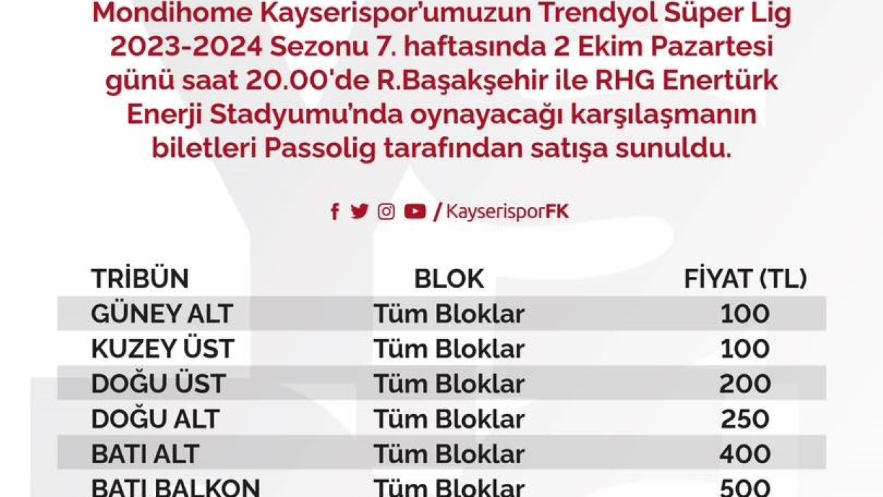 Süper Lig’in 7. haftasında oynanacak Kayserispor-Başakşehir maçının bilet fiyatları belli oldu. Kayserispor kulübünden yapılan açıklamaya göre; bilet fiyatları 100 TL ile 500 TL arasında değişiyor. Passolig aracılığıyla satışa sunulan bilet fiyatları şu şekilde:
