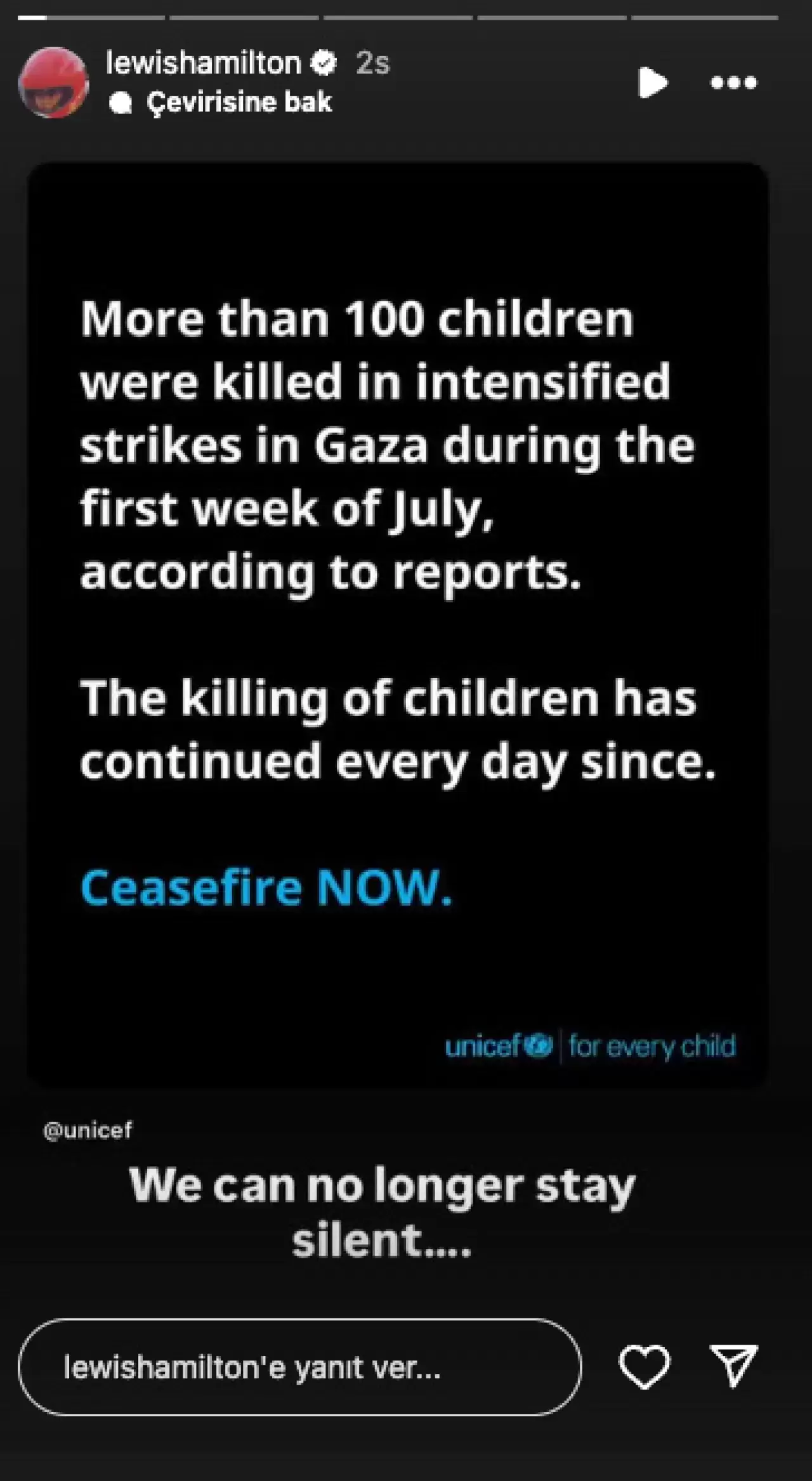 Hamilton, UNICEF’in temmuz ayının ilk haftasında 100’den fazla çocuğun öldüğünü belirttiği ve acil ateşkes çağrısı yaptığı paylaşımı alıntılayarak altına “Artık sessiz kalamayız” notunu düştü.