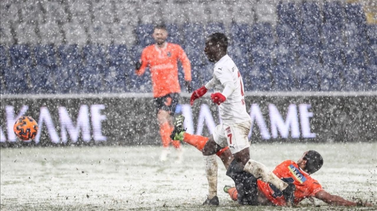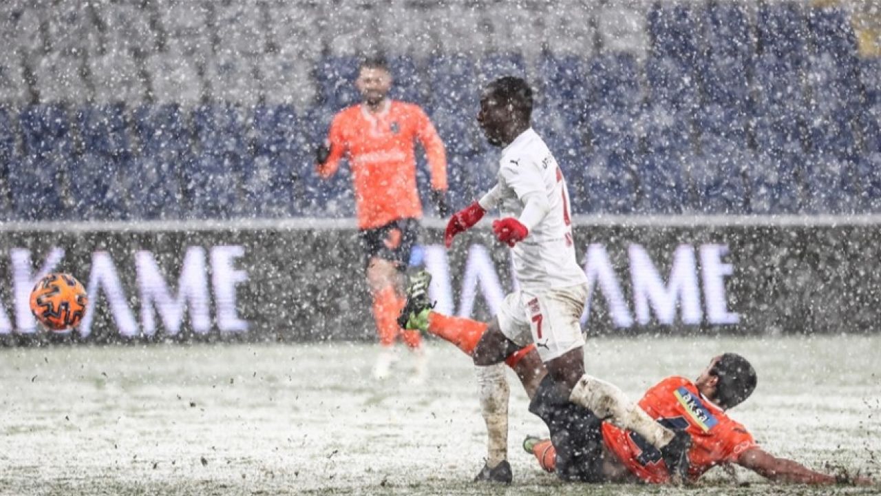 Medipol Başakşehir ile Demir Grup Sivasspor arasında oynanan karşılaşma, yoğun kar yağışında saha çizgilerinin görünmemesi nedeniyle üç kez durdu.