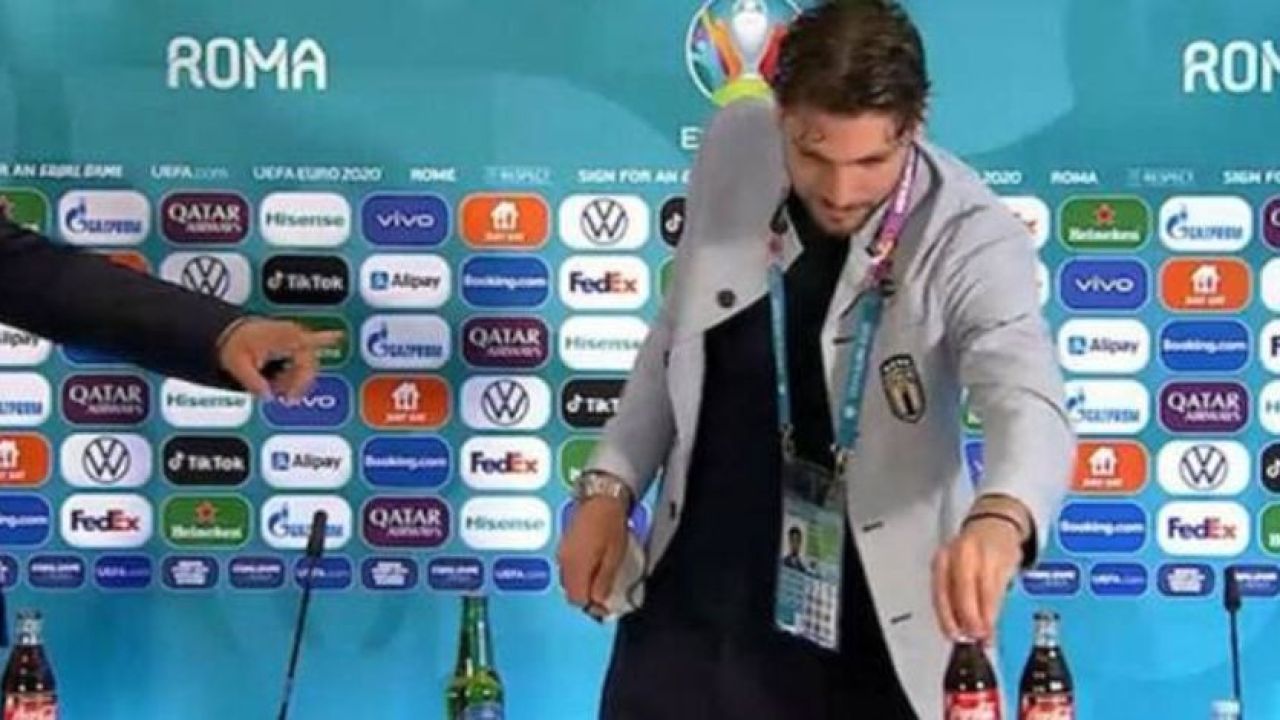 Cristiano Ronaldo geçtiğimiz gün basın toplantısı sırasında önünde duran Coca Cola şişelerini kaldırarak "su için" çağrısı yapmıştı. Ronaldo'nun ardından benzer bir harekette Locatelli'den geldi.