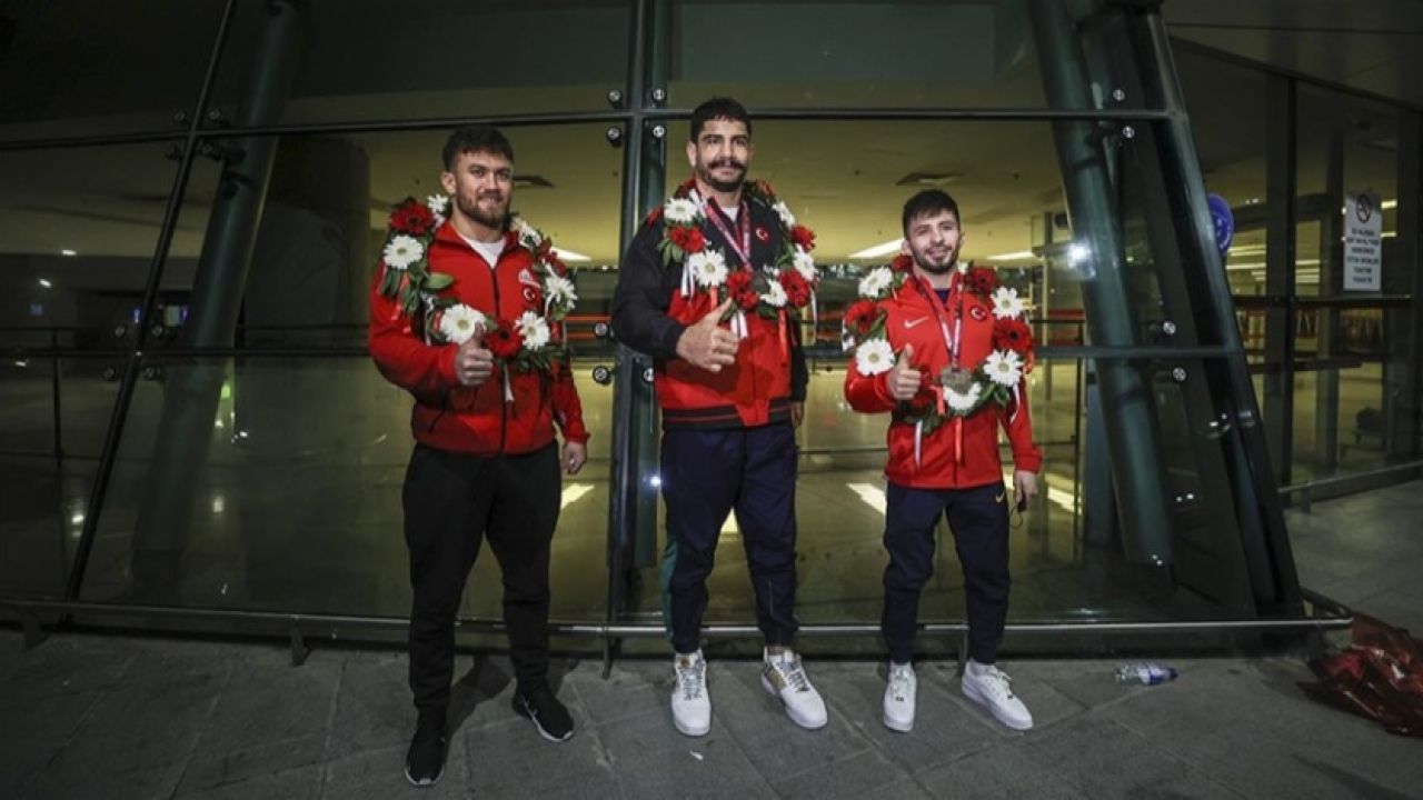 Altın madalya kazanan Taha Akgül ve Süleyman Atlı, gümüş madalya kazanan Süleyman Karadeniz ile takım yetkilileri, hava yoluyla İstanbul aktarmalı olarak Ankara Esenboğa Havalimanına geldi.