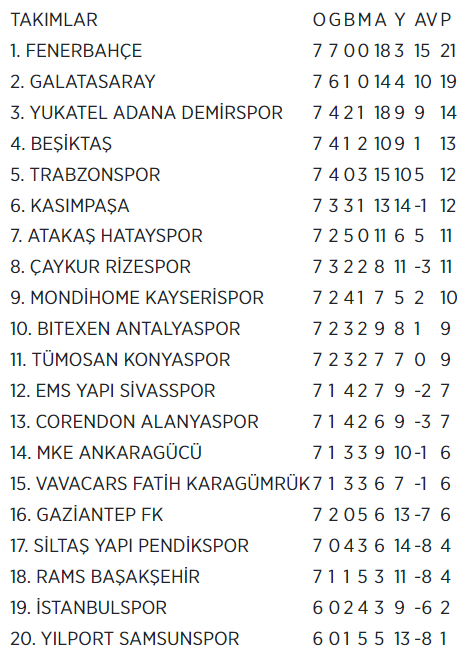 Tamamlanan 7. hafta maçlarının ardından oluşan puan durumu şu şekilde: