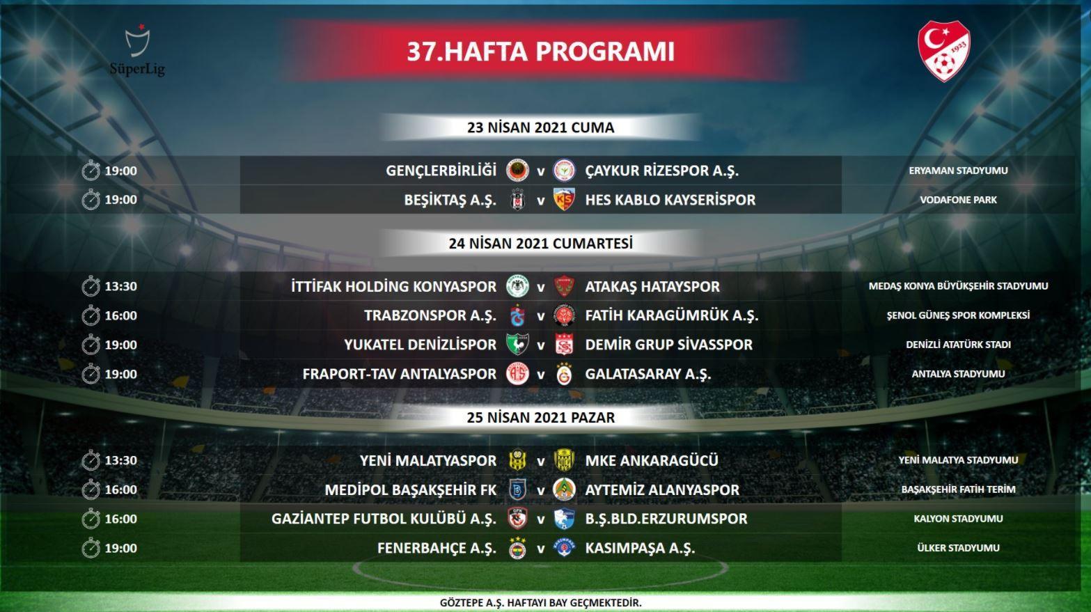 36. hafta Galatasaray ile Trabzonspor arasında oynanacak derbi maçının tarihi 21 Nisan Çarşamba olarak belirlendi. İstanbul'da oynanacak maç 19:00'da başlayacak.