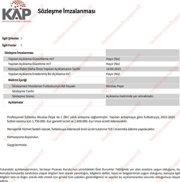 Profesyonel futbolcu Nicolas Pepe ile 1 (Bir) yıllık anlaşma sağlanmıştır. Yapılan anlaşmaya göre futbolcuya; 2023-2024 futbol sezonu için 1.750.000.-Eur garanti ücret ve 1.600.000.-Eur imza ücreti ödenecektir. Menajerlik hizmet bedeli olarak, futbolcuya ödenecek brüt ücret tutarının %5'i oranında ödeme yapılacaktır.
