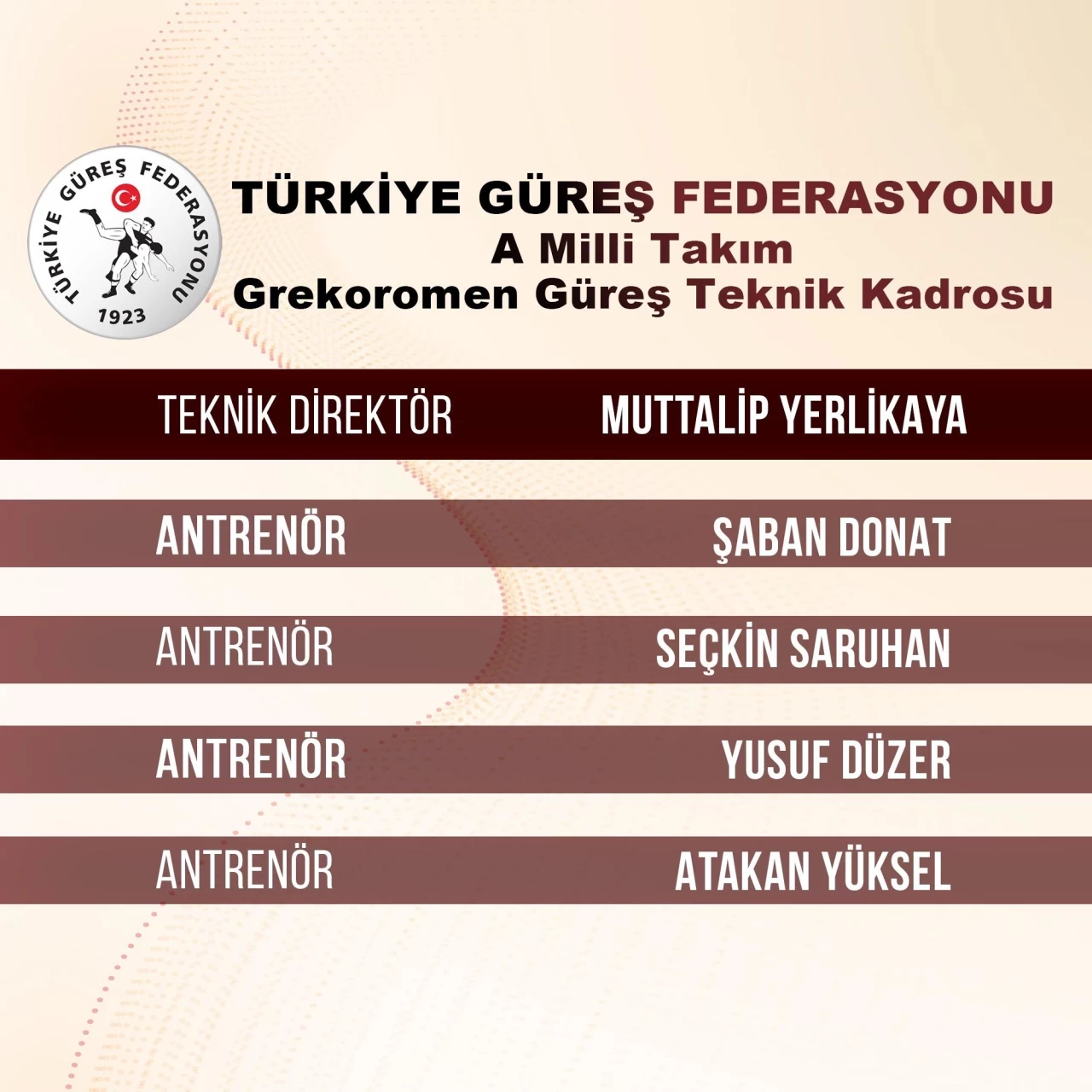 Türkiye Güreş Federasyonu'nun duyurusuna göre, A Milli Takım'ın teknik kadrosunda şu isimler görev yapacak: