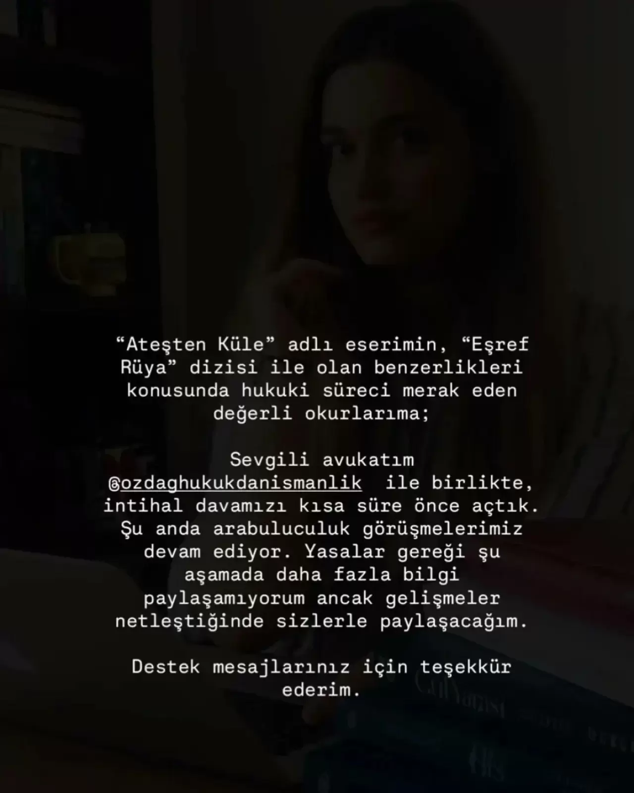 Sevgili avukatım Aybüke Özdağ Yılmaz ile birlikte, intihal davamızı kısa süre önce açtık. Şu anda arabuluculuk görüşmelerimiz devam ediyor. Yasalar gereği şu aşamada daha fazla bilgi paylaşamıyorum ancak gelişmeler netleştiğinde sizlerle paylaşacağım. Destek mesajlarınız için teşekkür ederim. “ ifadelerini kullandı.
