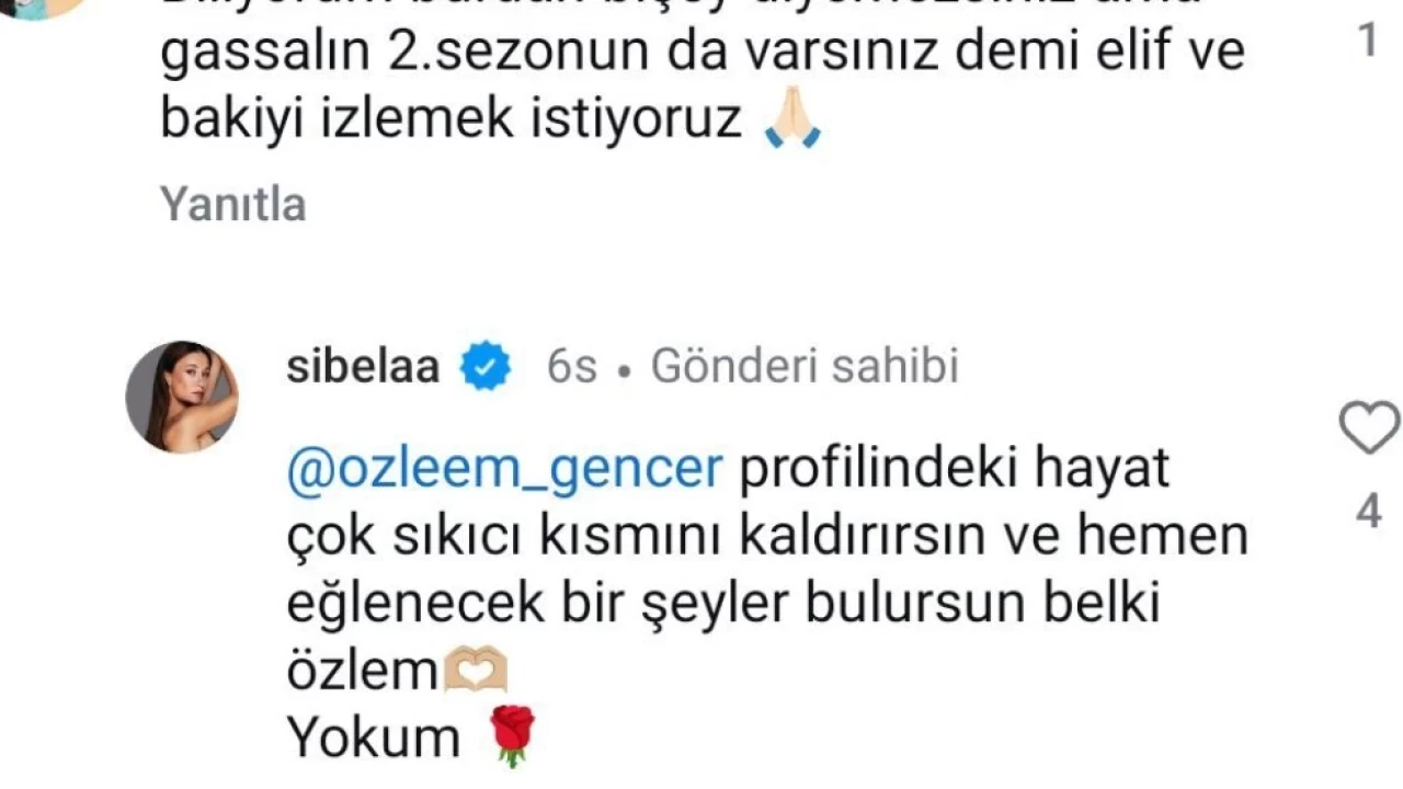 Oyuncu Sibel Aytan bir takipçisinin, "2 sezonda varsınız değil mi? Elif ve Baki'yi izlemek istiyorum" sorusuna "Yokum" cevabını verdi.