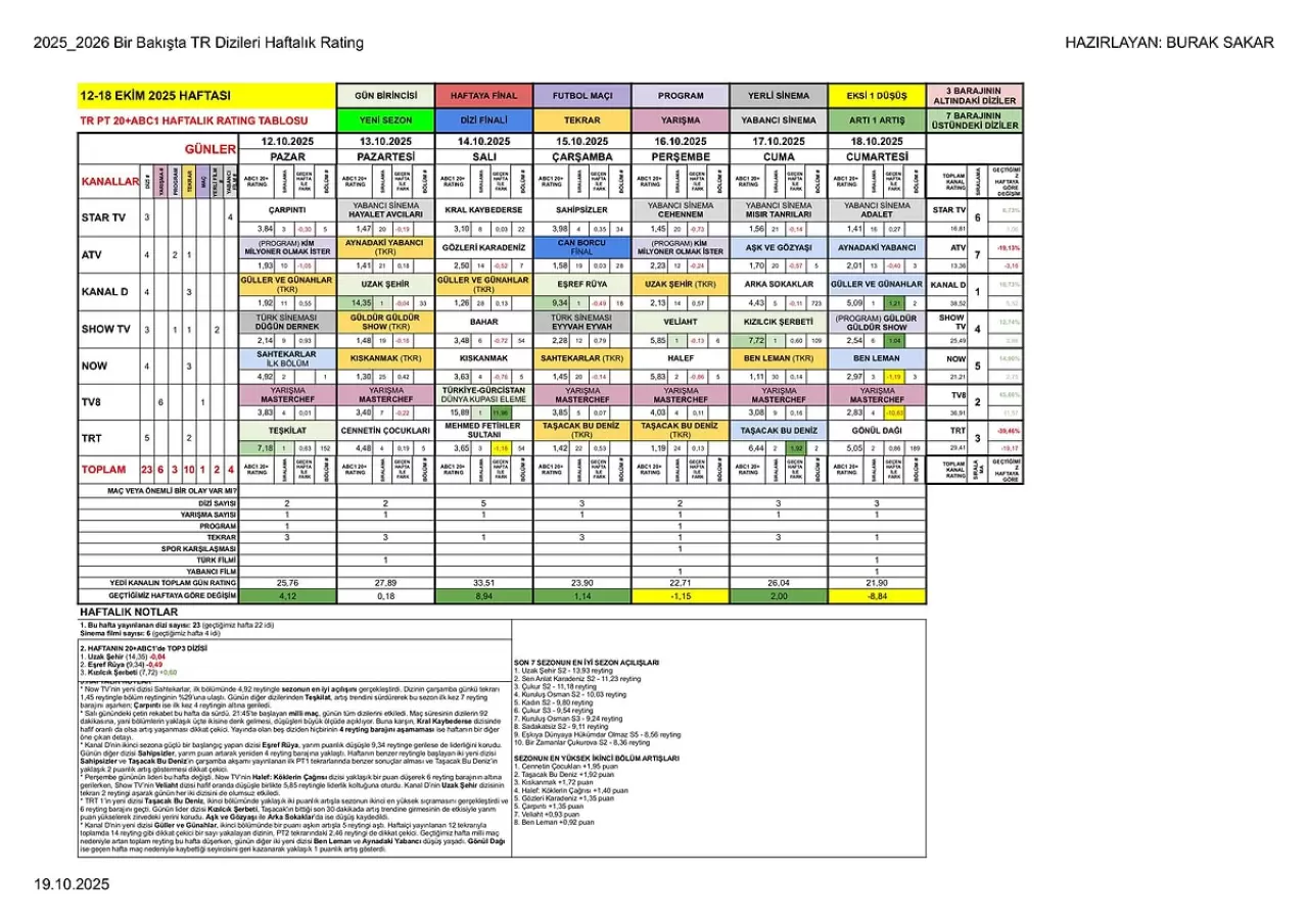 Birbirinden iddialı projelerin yer aldığı bu sezonda, geçtiğimiz yıldan devam eden bazı dizilerde düşüşler gözlemleniyor. Öte yandan, yeni sezonda başlayan yapımlar arasında Taşacak Bu Deniz ve Ben Leman gibi diziler ön plana çıkarken, hâlâ beklenen izlenme oranlarını yakalayamayan yapımlar da mevcut. Reytinglerde iniş çıkışların yaşandığı, liderlik sıralamasının sık sık değiştiği bu dönemde, Ekim 2025'in ilk iki haftasında en çok izlenen diziler merak konusu haline geldi.