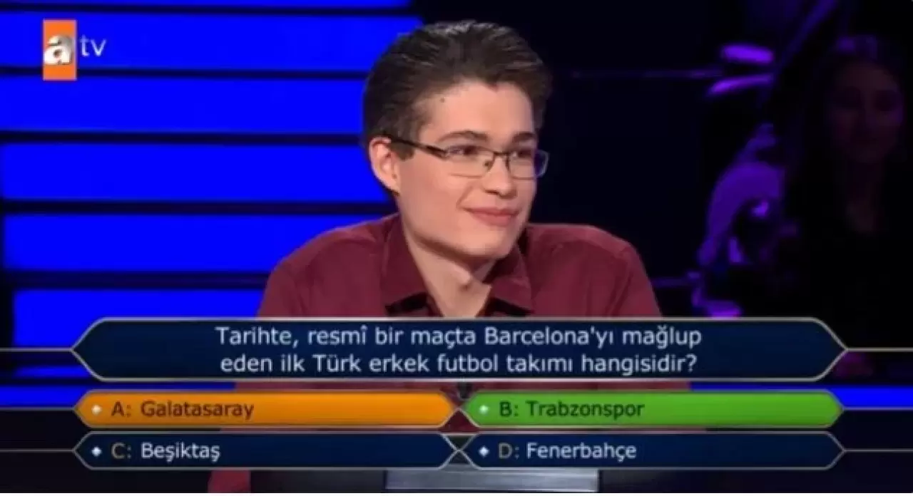 Kim Milyoner Olmak İster yarışması 1229. bölümünde 500 bin TL değerinde soru yöneltti. İzleyiciler arasında dikkat çeken soru arama motorlarında yoğun olarak araştırılmaya başlandı. Peki, Tarihte, resmi bir maçta Barcelona'yı mağlup eden ilk Türk erkek futbol takımı hangisidir? Cevap haberimizde.
