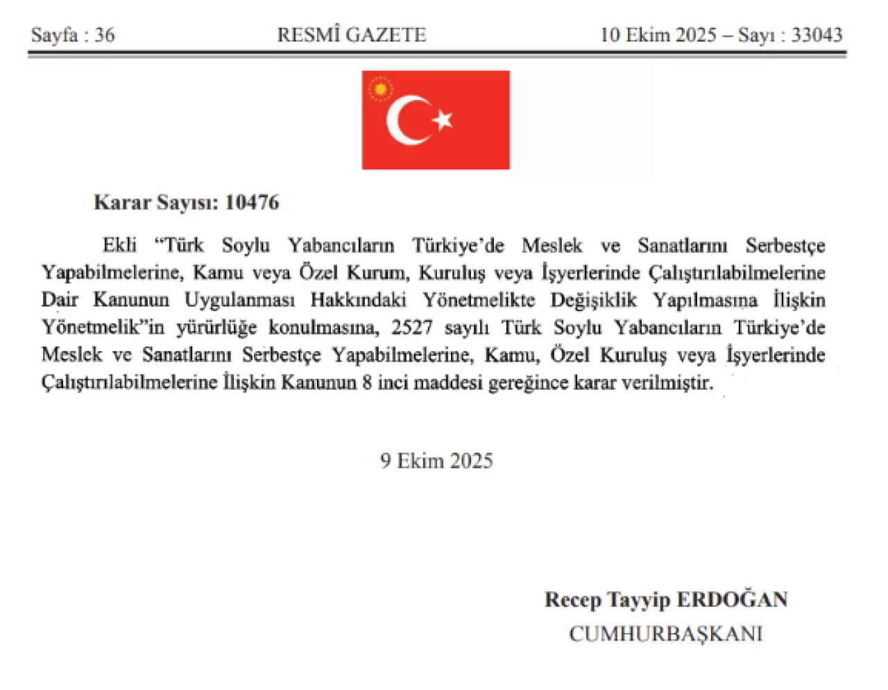 "Türk Soylu Yabancıların Türkiye'de Meslek ve Sanatlarını Serbestçe Yapabilmelerine, Kamu veya Özel Kurum, Kuruluş veya İşyerlerinde Çalıştırılabilmelerine Dair Kanunun Uygulanması Hakkındaki Yönetmelikte Değişiklik Yapılmasına İlişkin Yönetmelik" 10 Ekim'de Resmi Gazete'de yayımlandı.