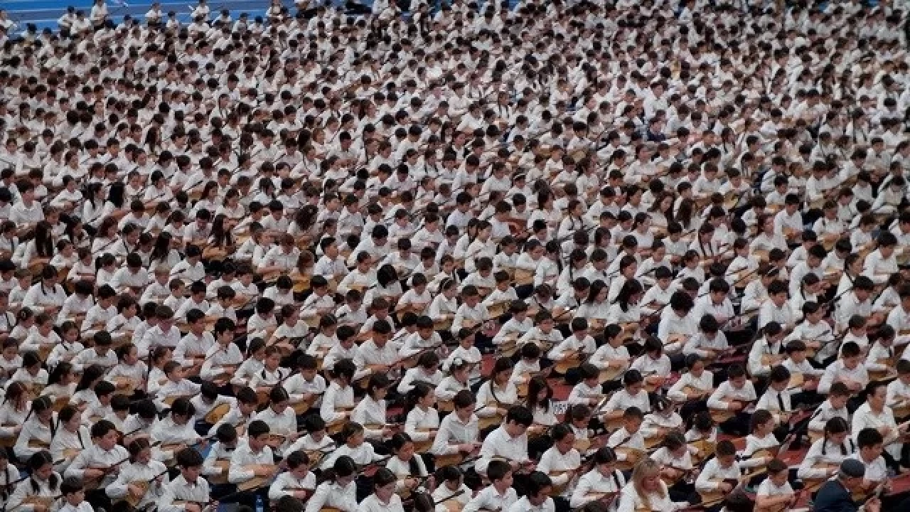 3 bin 200 öğrenci aynı anda, Kazak besteci Kurmangazi Sagırbayulı'nın "Balbıraun" adlı ezgisini dombrayla çalarak, rekor kırdı.