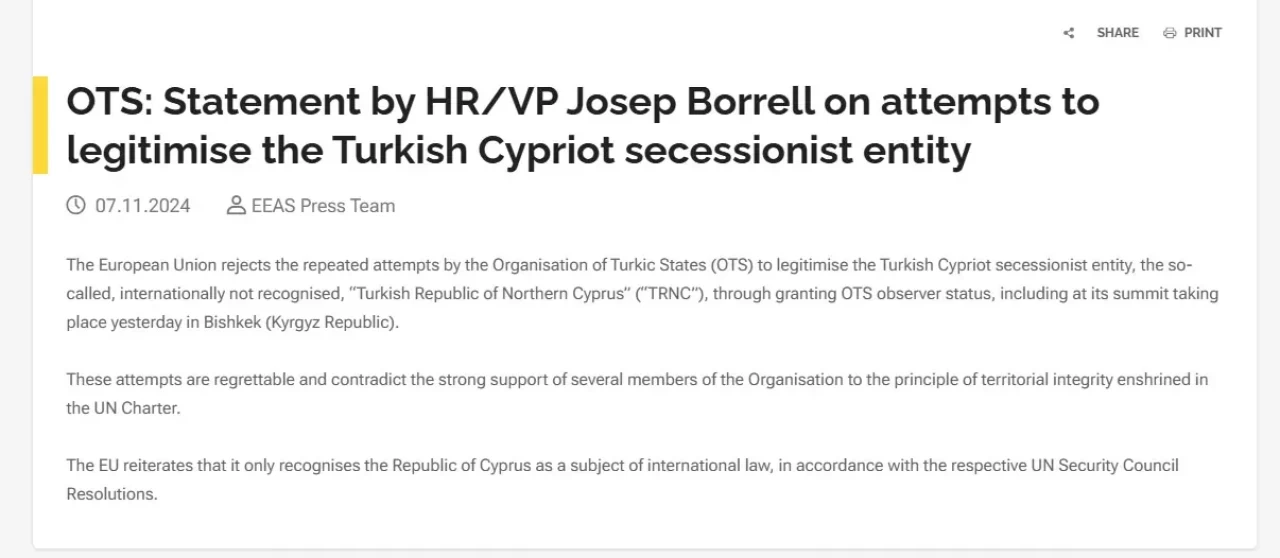 "Avrupa Birliği, OTS'nin Kıbrıslı Türk ayrılıkçı varlığını, uluslararası alanda tanınmayan sözde Kuzey Kıbrıs Türk Cumhuriyeti'ni, dün Bişkek'te gerçekleşen zirve de dahil olmak üzere, gözlemci statüsü vererek meşrulaştırmaya yönelik tekrarlanan girişimlerini reddediyor."