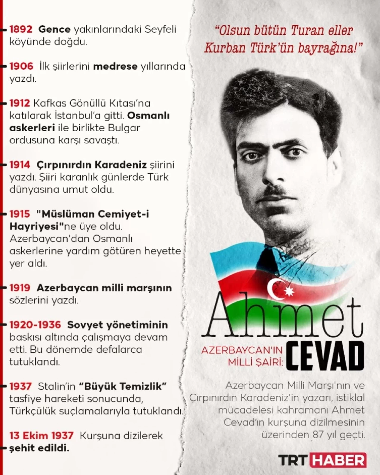 Gence’de 1914’te tarihinde yazdığı “Çırpınırdın Karadeniz” şiiri, o karanlık günlerde Türk dünyasına umut ışığı oldu: