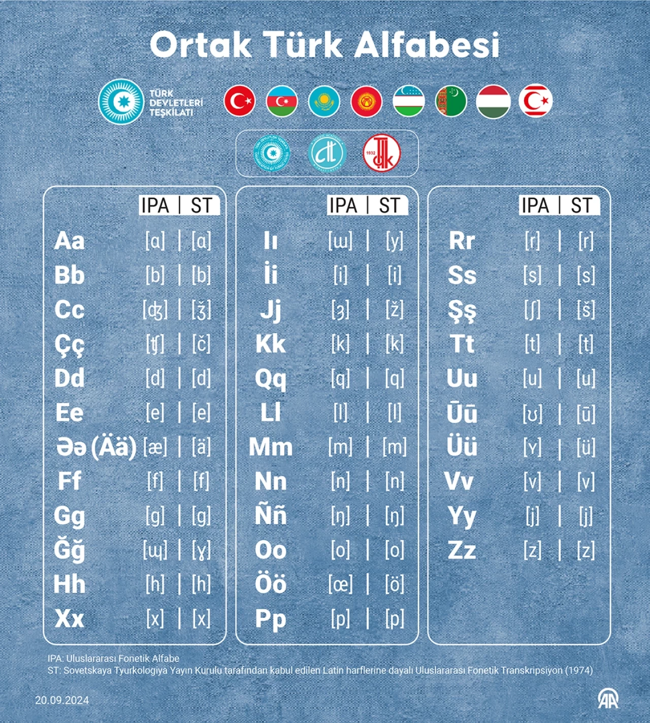 Ortak Türk Alfabesini Türkiye, Azerbaycan, Kazakistan, Kırgızistan, Tataristan, K.K.T.C. ve Özbekistan kullanacak.