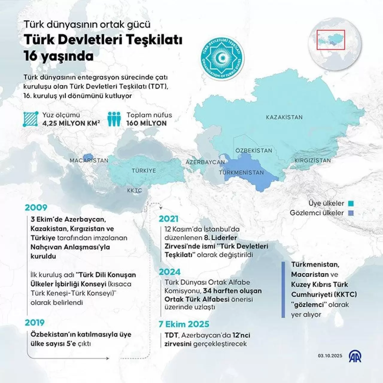 Türk Devletleri Teşkilatı'nın (TDT) sadece işbirliği platformu değil, ciddi jeopolitik merkezlerden biri olarak şekillendiğini söyleyen Aliyev, TDT'nin nüfuzunun uluslararası düzeyde artmasının memnuniyet verici olduğunu belirtti.