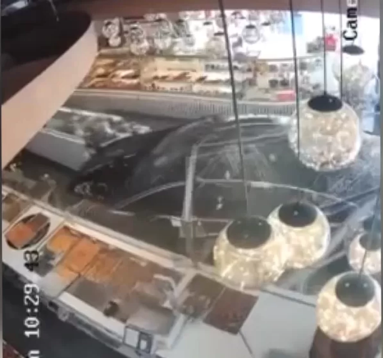 Kaza anı, iş yerinin güvenlik kamerasınca kaydedildi. Görüntülerde, hızla gelen otomobilin pastaneye girmesi, reyonlara çarparak durması ve dükkandan çıkması yer aldı.