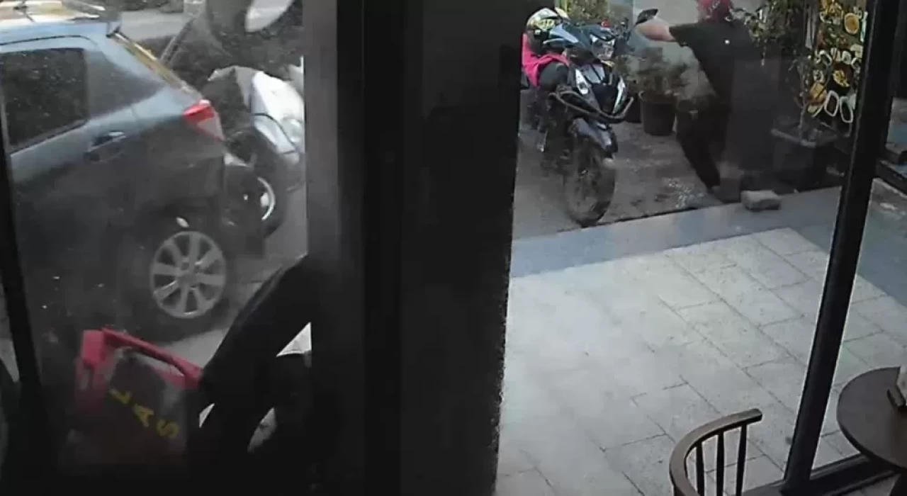 Ardından iki dükkana çarpan araç, yol kenarında restoranın önünde bulunan bir motokuryeyi de son anda teğet geçti.