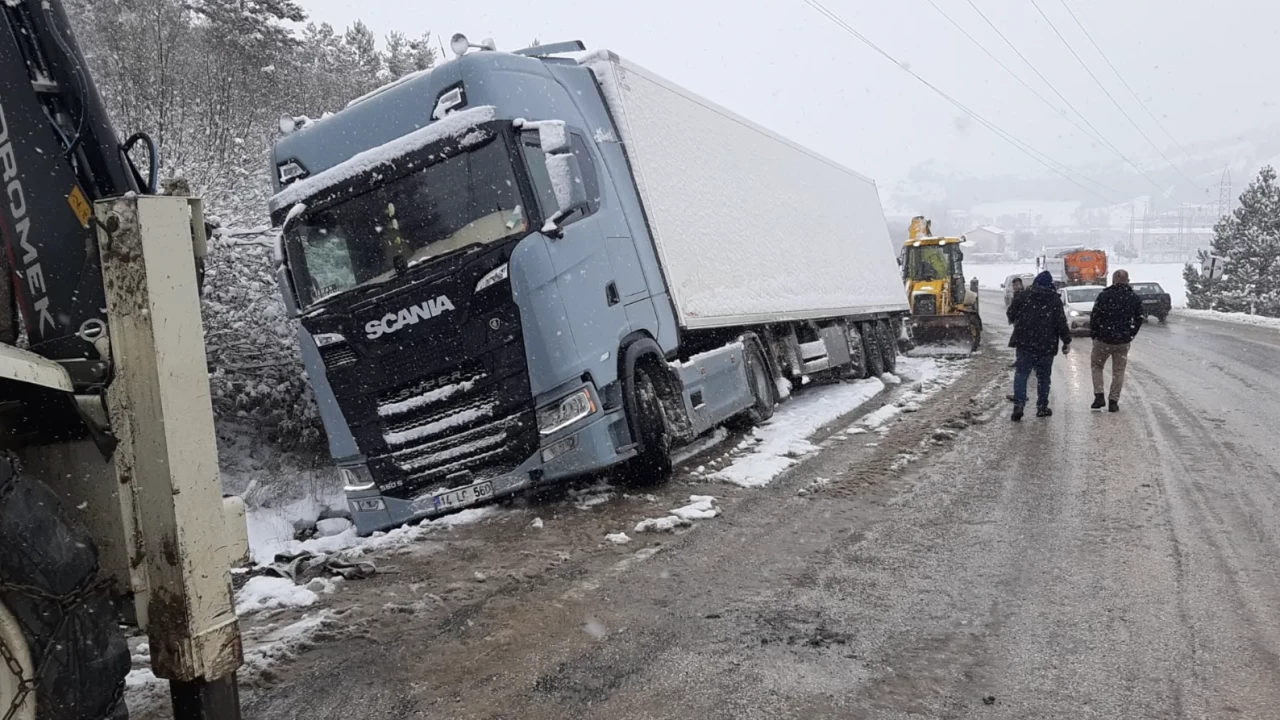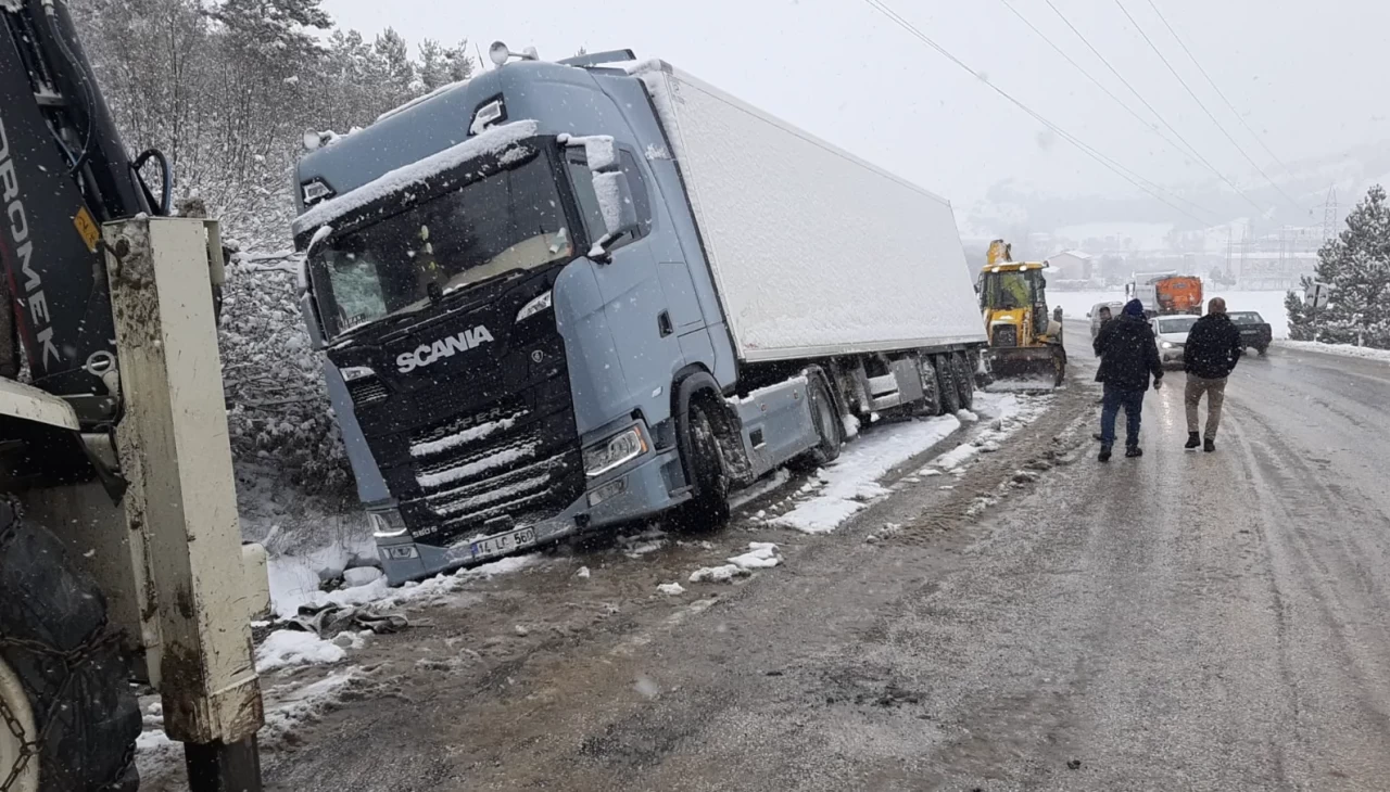 Yoğun kar yağışının etkisini sürdürdüğü Bolu’nun Mudurnu ilçesi ile Ankara’nın Nallıhan ilçesini birbirine bağlayan karayolunda, yolda ilerleyen bir tır rampada kayarak kontrolden çıktı. Kaygan zemin nedeniyle savrulan tır, yol kenarındaki şarampole yan yattı.