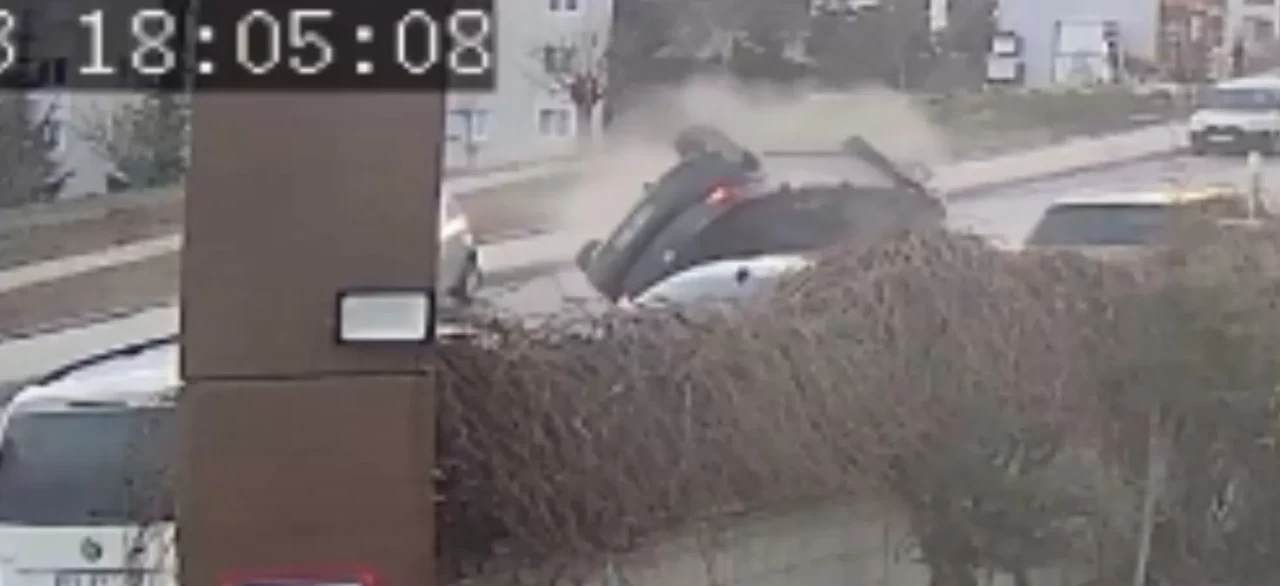 Kaza anı bir iş yerinin güvenlik kamerası tarafından saniye saniye kaydedildi. Görüntülerde otomobillerin çarpıştığı ve bir aracın ters döndüğü anlar yer aldı.