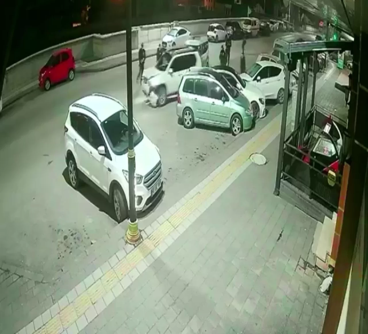 Öte yandan, yaşanan olay çevredeki bir iş yerinin güvenlik kamerasına yansıdı. Görüntülerde, güvenlik görevlileri ve polis ekiplerinin aracı durdurmaya çalıştığı, sürücünün ise kaçmaya devam ederek ekip aracı ve park halindeki otomobillere çarptığı anlar yer aldı. Ayrıca, polis ekiplerinin kaçan aracı durdurmak amacıyla lastiklerine ateş ettiği anlar da kameralara yansıdı.