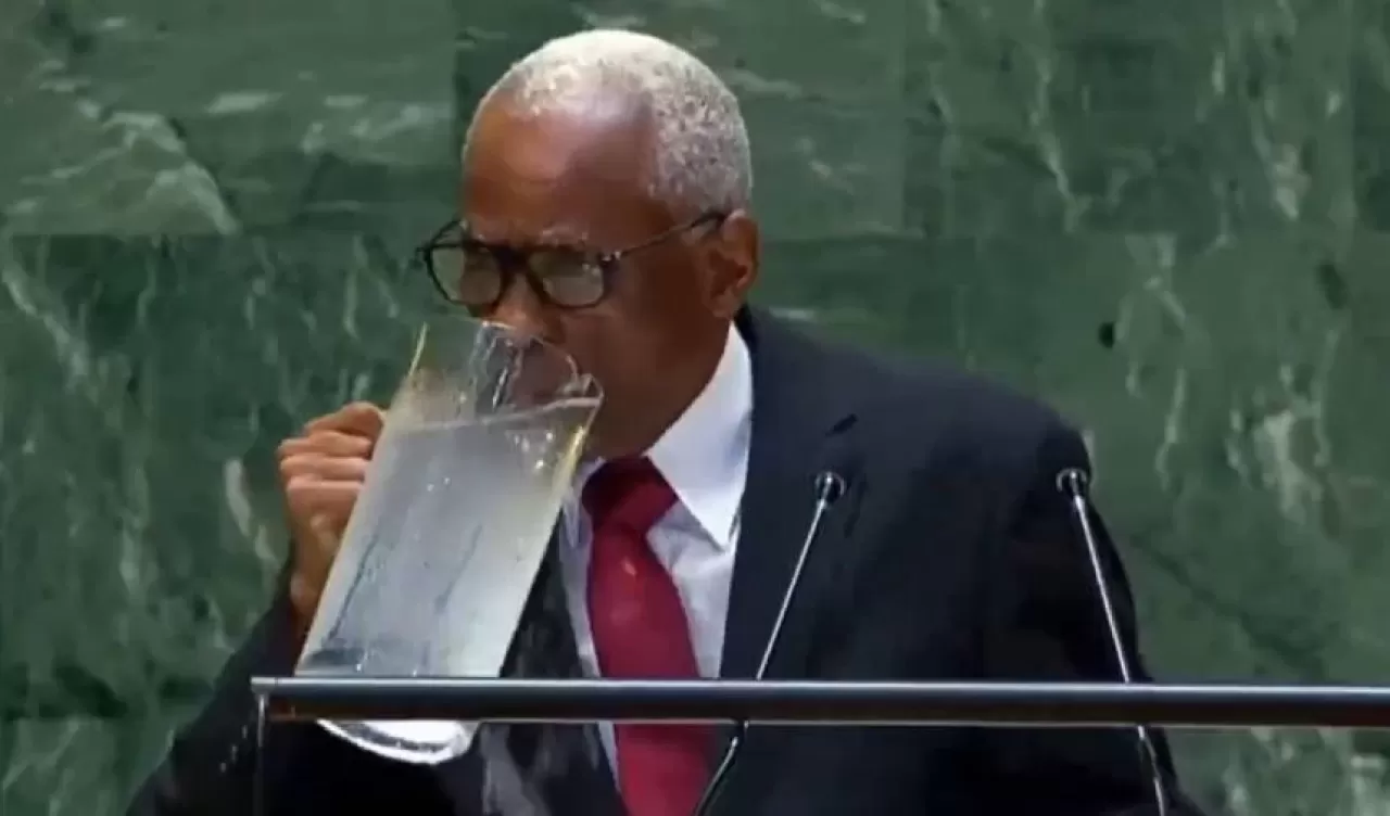 Haiti Geçici Başkanlık Konseyi Başkanı Edgard Leblanc Fils, Birleşmiş Milletler (BM) 79. Genel Kurulu’na hitabı sırasında kürsüdeki bardağı kullanmak yerine sürahiden su içti.