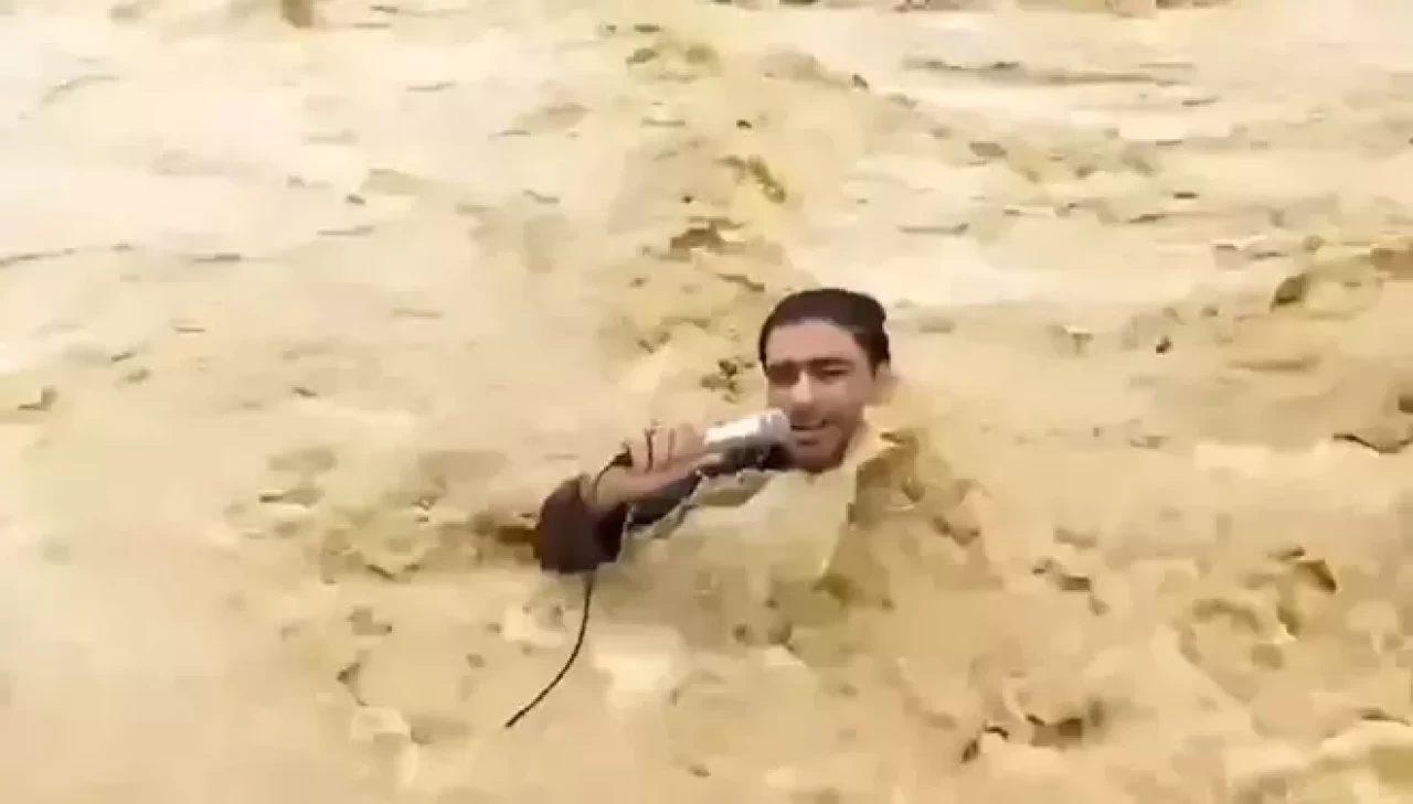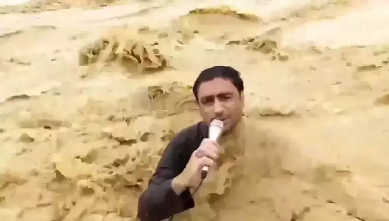Görüntülere göre yerel kanal Ruhi TV'nin muhabiri Ali Musa Rıza, Pencap eyaletinde yayın yaparken sele kapıldı.