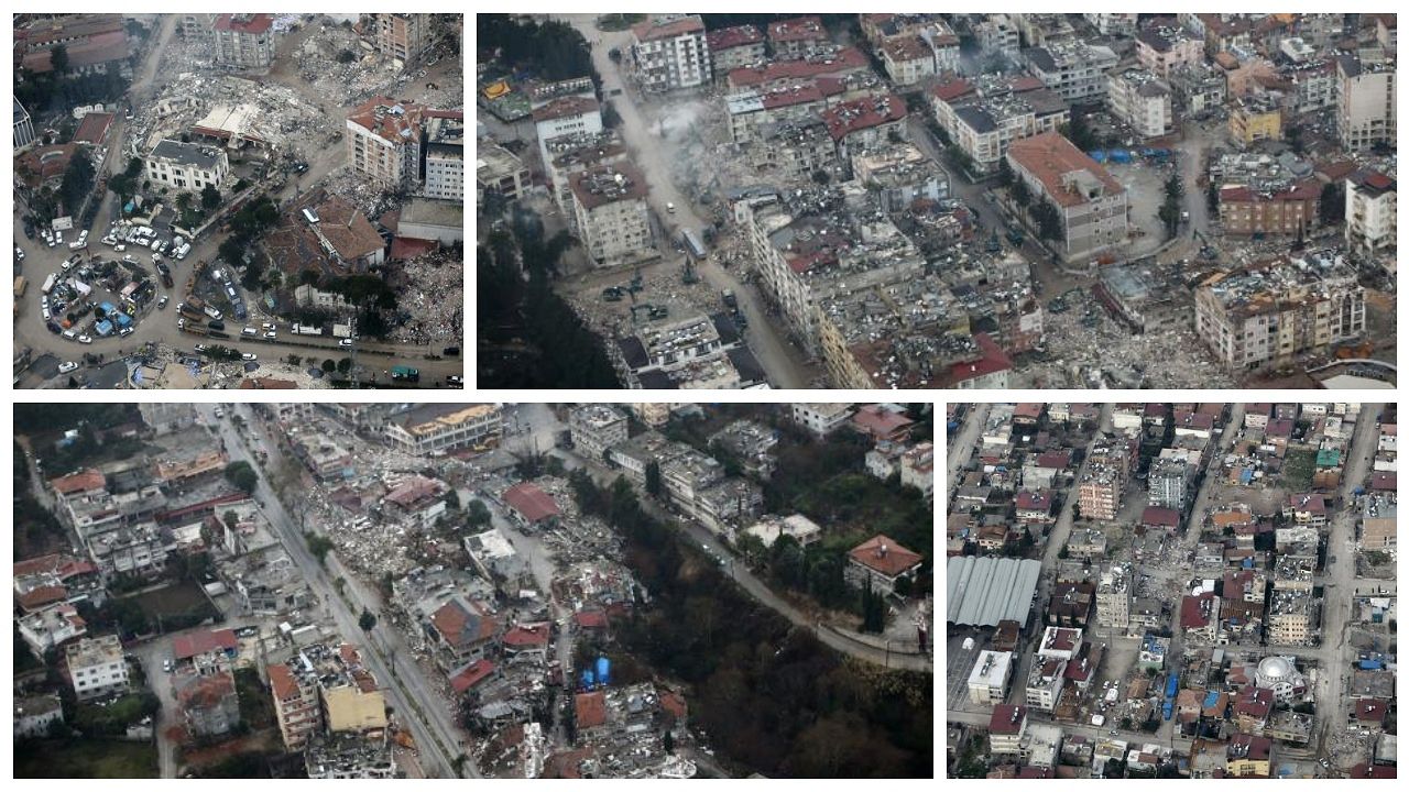Kahramanmaraş ve Hatay merkezli depremlerin ardından Antakya ve Defne ilçelerinde yıkılmış veya ağır hasarlı çok sayıda bina, helikopterden görüntülendi.