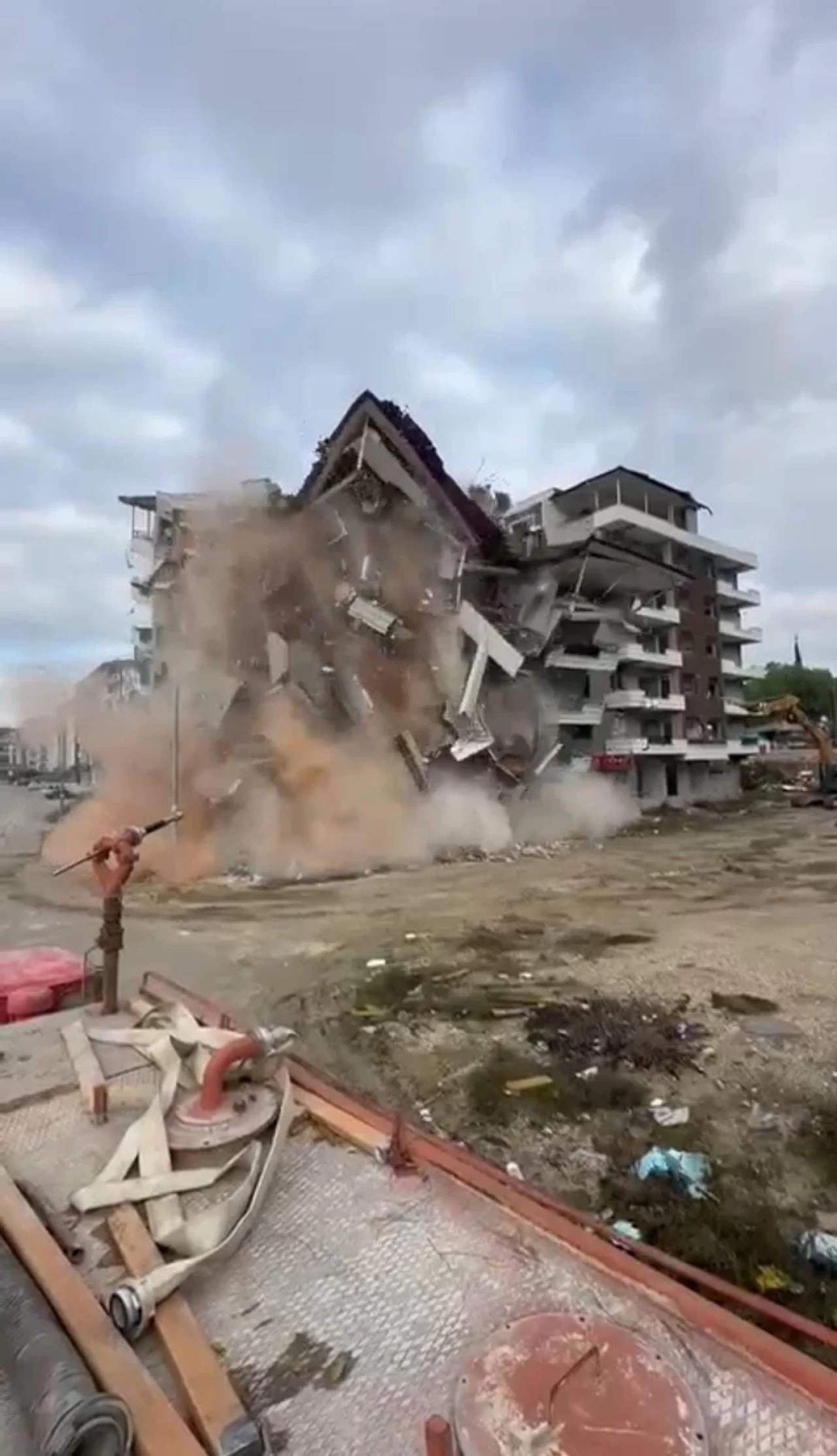 Defne ilçesi Çekmece Mahallesi'nde bulunan 7 katlı bina, iş makinesiyle kolonlarına zarar verildikten sonra korna sesiyle yıkıldı. Binanın yıkılma anı kameralara anbean yansıdı. 7 katlı binanın yıkımı esnasında herhangi bir olumsuzluk yaşanmadı.