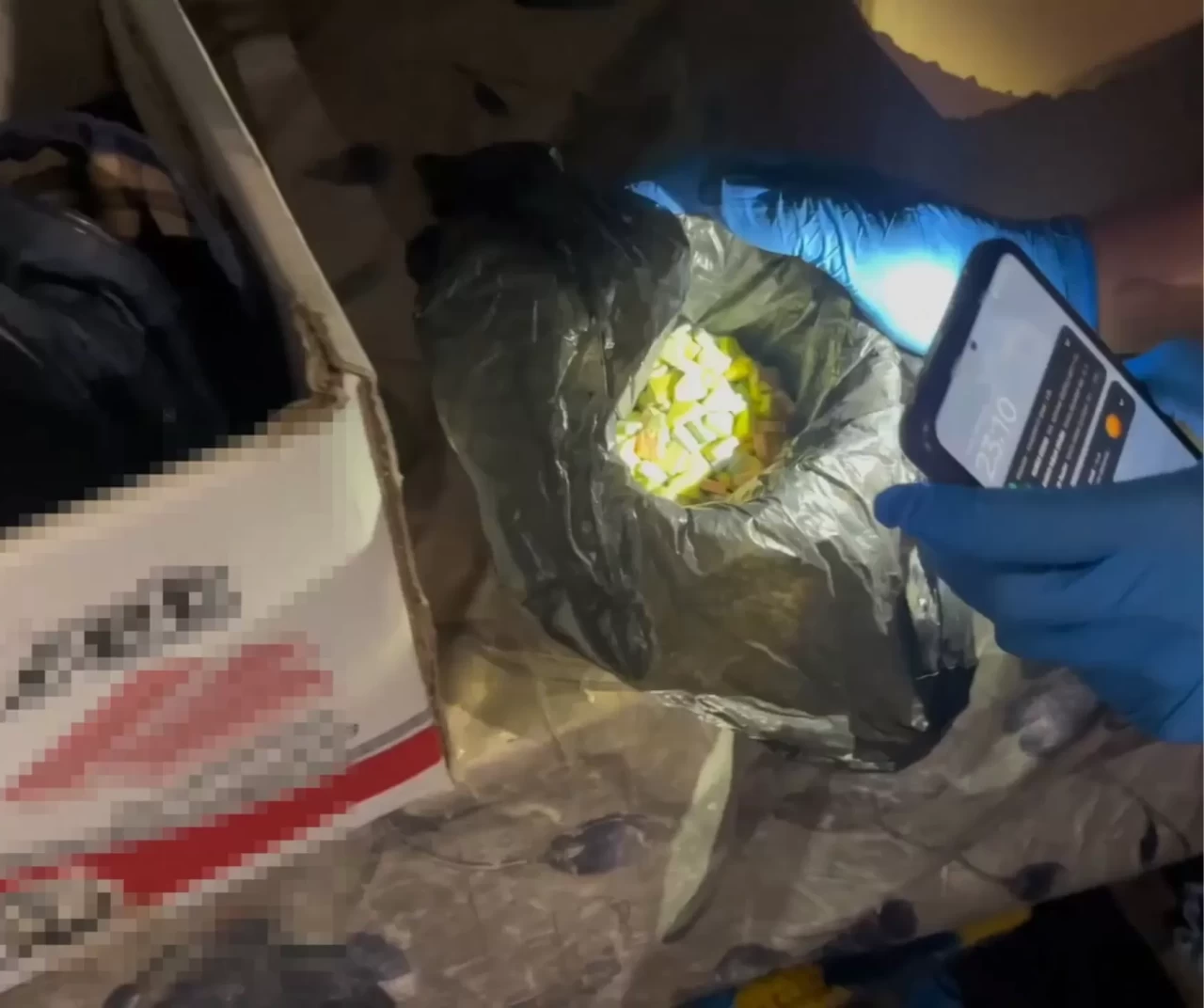 Narkotik ekiplerinin ikamette arama yapması ve bir kutuya gizlenmiş uyuşturucu hapları bulması polis kamerasınca görüntülendi.