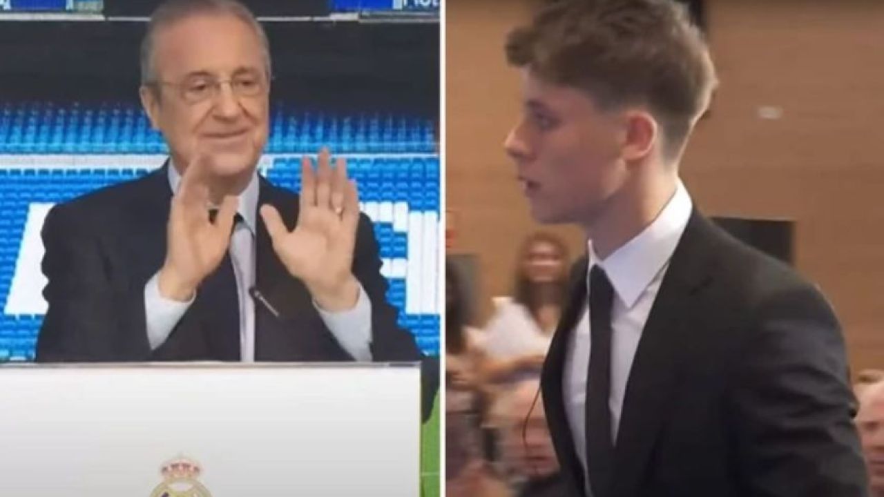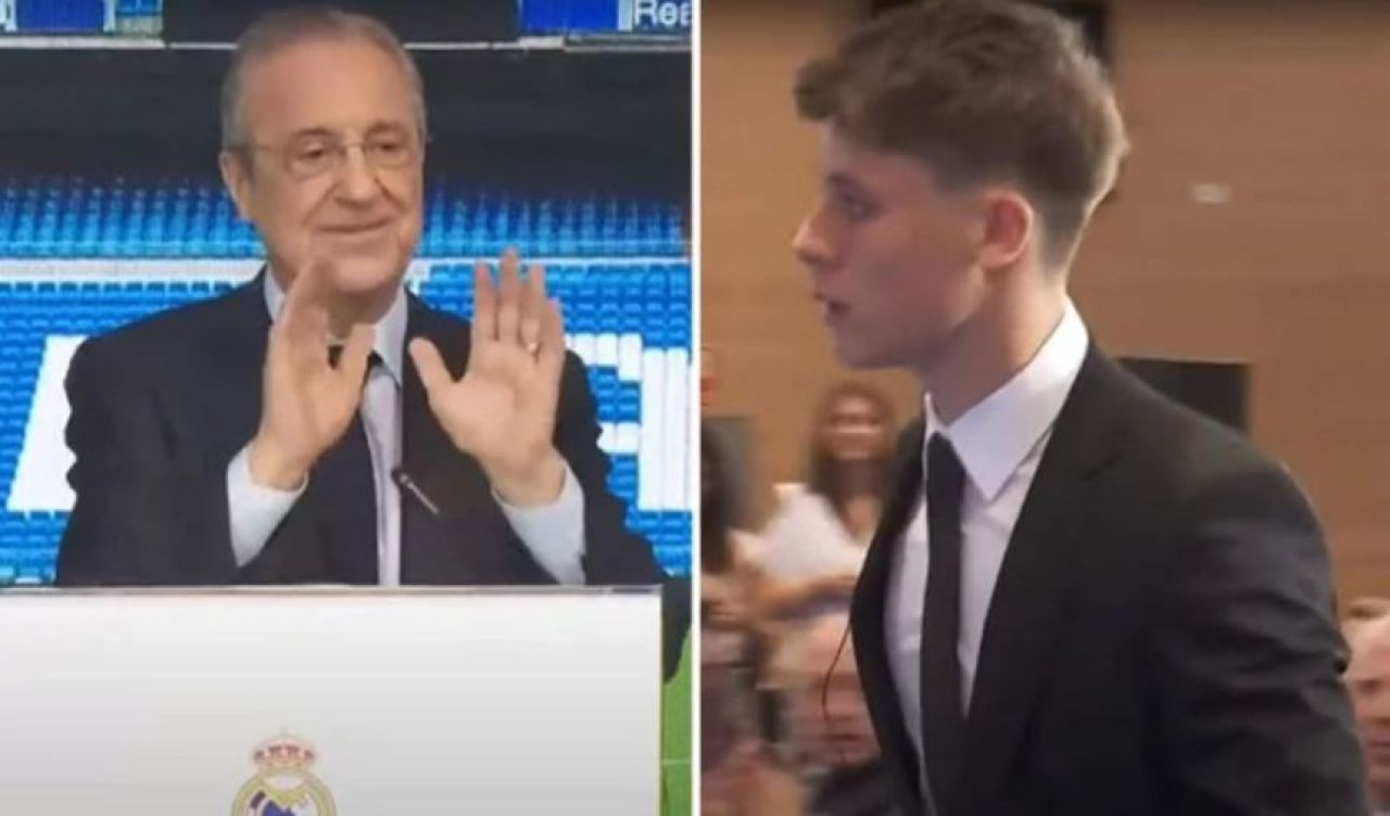 Arda Güler, adının geçtiğini duyunca yerinden kalktı ve hazırlandı. Bu sırada Real Madrid Başkanı Florentino Perez eliyle "Dur" işareti yaptı. Ancak genç yıldız, heyecandan bu işareti görmedi ve Perez'in konuşmasının geri kalanında yanında durdu.