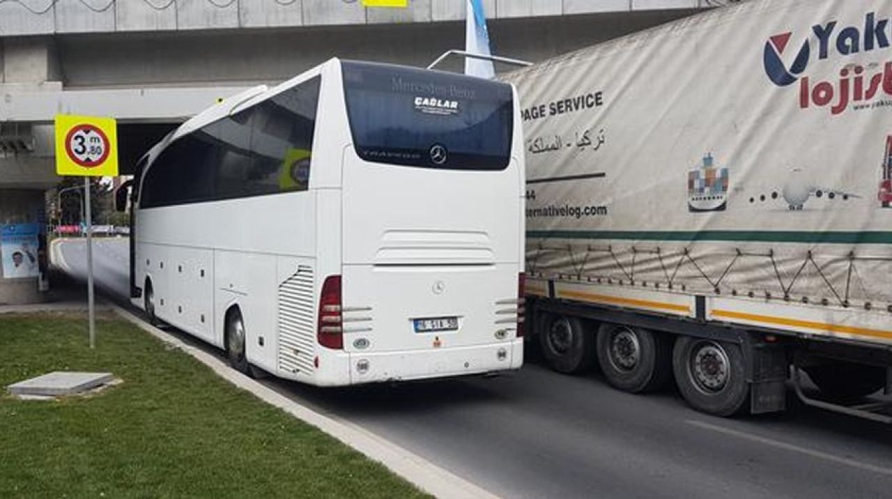 Bakırköy’de tır, tren alt geçidine takılarak mahsur kaldı. İtfaiye ekiplerinin tırı kurtarma çalışmaları sırasında tur otobüsü de geçitteki engele takılınca yol trafiğe kapandı.