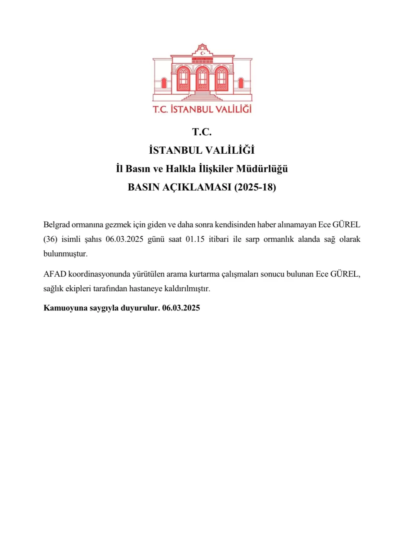 İstanbul Valiliği, yaptığı açıklamada Ece Gürel'in sağ olarak bulunduğunu doğruladı.