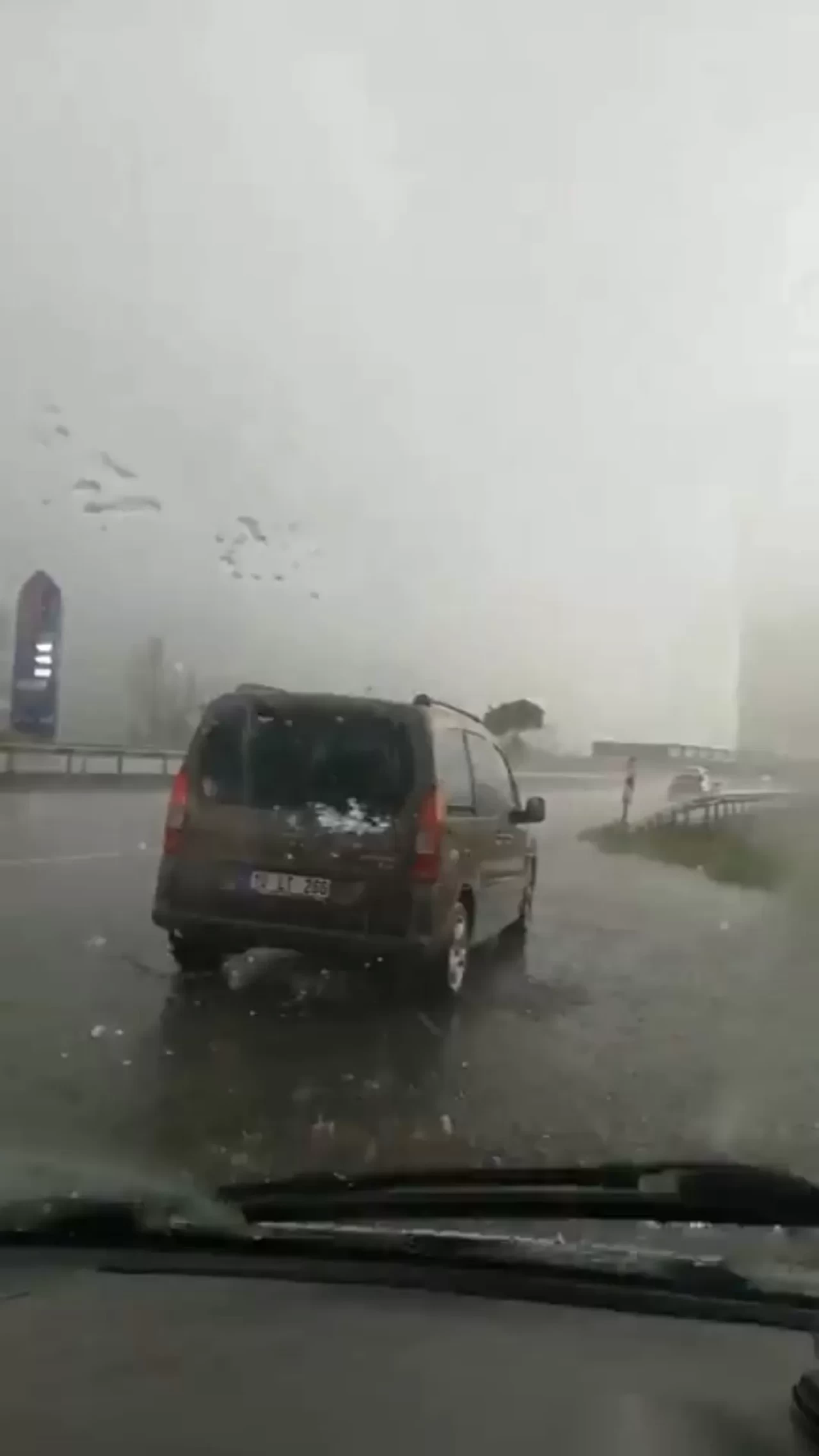 Bursa-Ankara karayolunun Kestel ilçesi Ümitalan rampası mevkiinde meydana gelen şiddetli dolu yağışı nedeniyle, pek çok sürücü araçlarını yol kenarına park etmek zorunda kaldı.