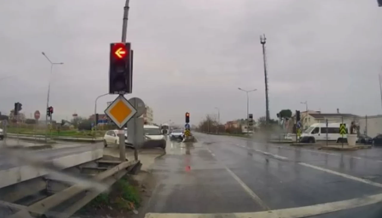 İstanbul’un Büyükçekmece ilçesinde kırmızı ışık ihlali sonucu meydana gelen trafik kazası, başka bir sürücünün araç içi kamerası tarafından kaydedildi.