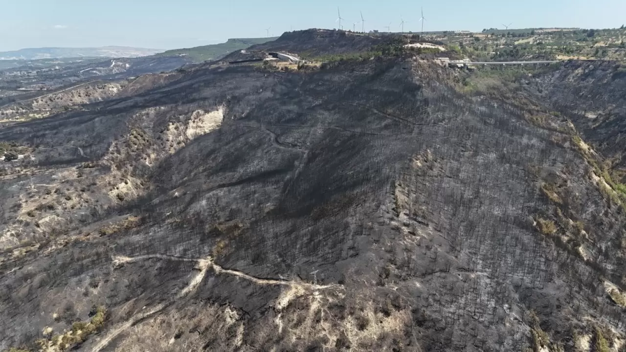 Bölgede soğutma çalışmaları devam ederken yangının verdiği tahribat, drone ile havadan görüntülendi.