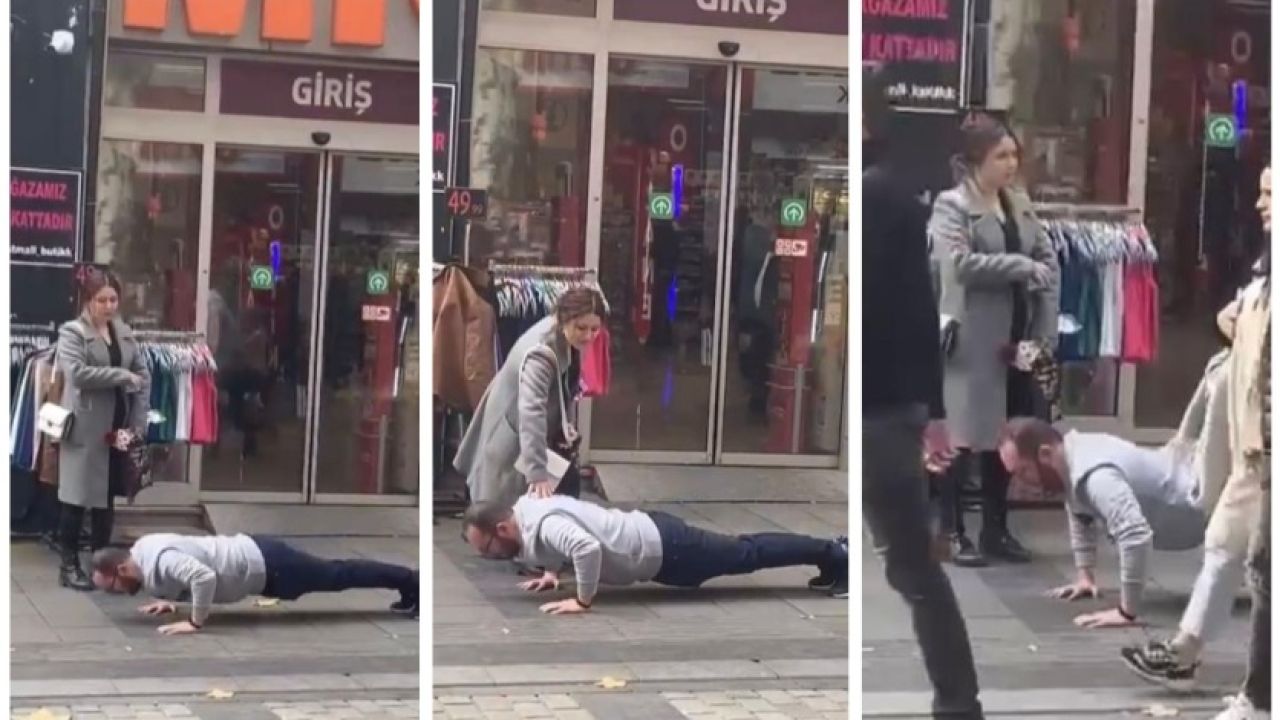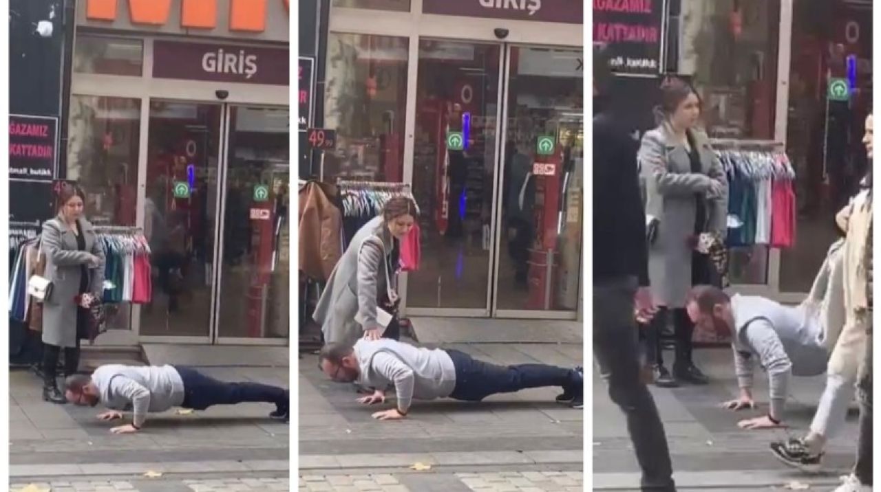 Olay, geçtiğimiz günlerde İstanbul Pendik’teki çarşıda yaşandı. Edinilen bilgiye göre, bir kadın, yanında bulunan ve eşi olduğu iddia edilen adama çarşının ortasında şınav çektirdi. Görenleri şaşkına çeviren o anlar bir vatandaşın cep telefonu kamerasına saniye saniye yansıdı. Görüntülerde, adamın cadde ortasında şınav çektiği, yoldan geçen vatandaşların o anları şaşkınlıkla izlediği görülüyor.