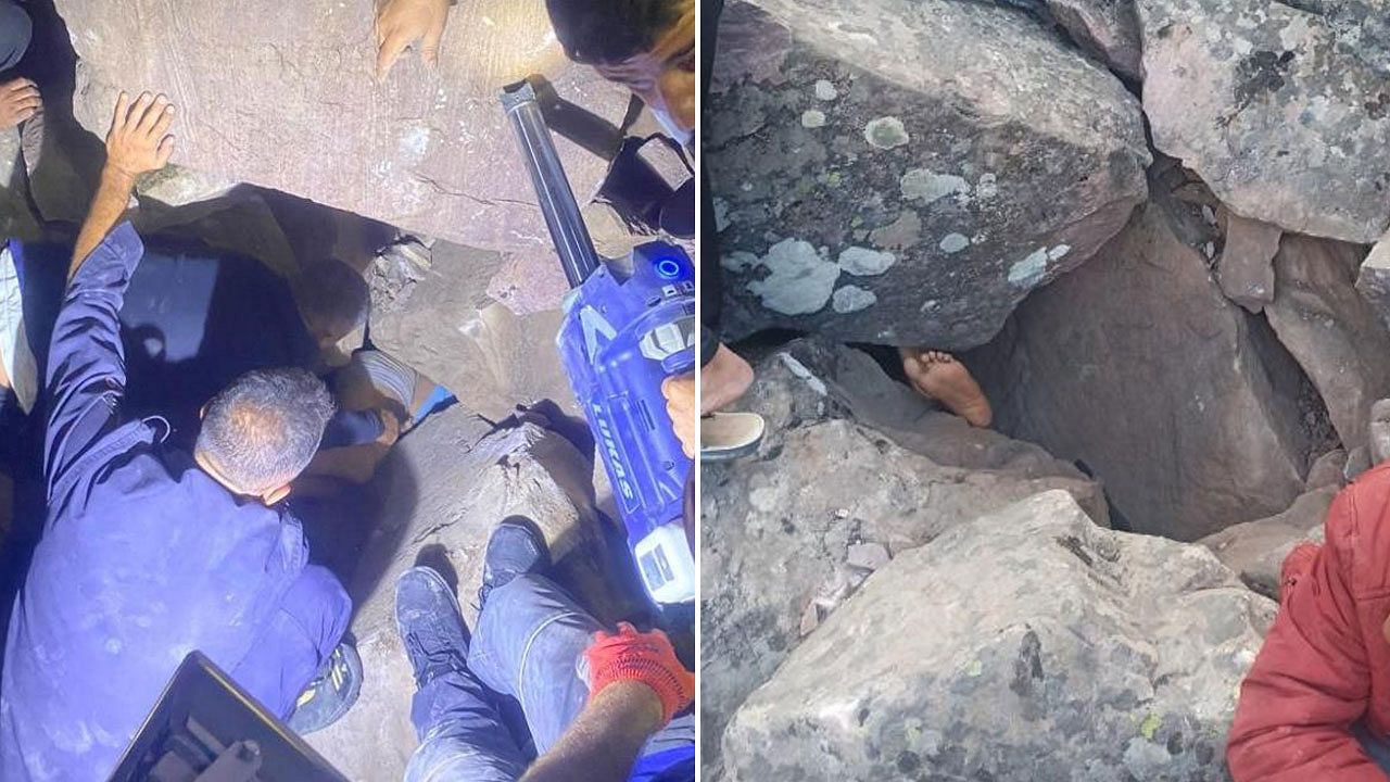 Hatay’da bir kişi Taşoluk Mahallesi’ndeki devasa kayaların arasında sıkıştı.