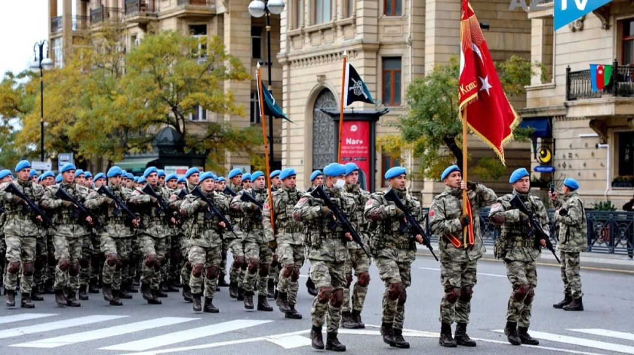 Ermenistan karşısında elde edilen zafer kapsamında 10 Aralıkta yapılacak kutlama töreni için Bakü'ye gelen Türk askeri sokaklarda yürüyüş gerçekleştirdi.
