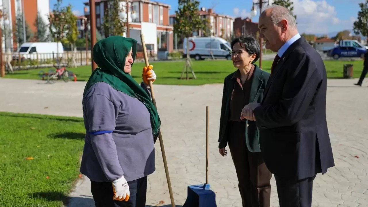 Cumhuriyet Bayramı’na özel düzenlenen sosyal deneyde, Türk bayrağını yere düşürmemek için gösterdiği duyarlılıkla milyonların kalbini kazanan temizlik görevlisi Rukiye Tuna, Düzce Belediye Başkanı Dr. Faruk Özlü ve eşi Prof. Dr. Onur Özlü tarafından görev başında ziyaret edildi.