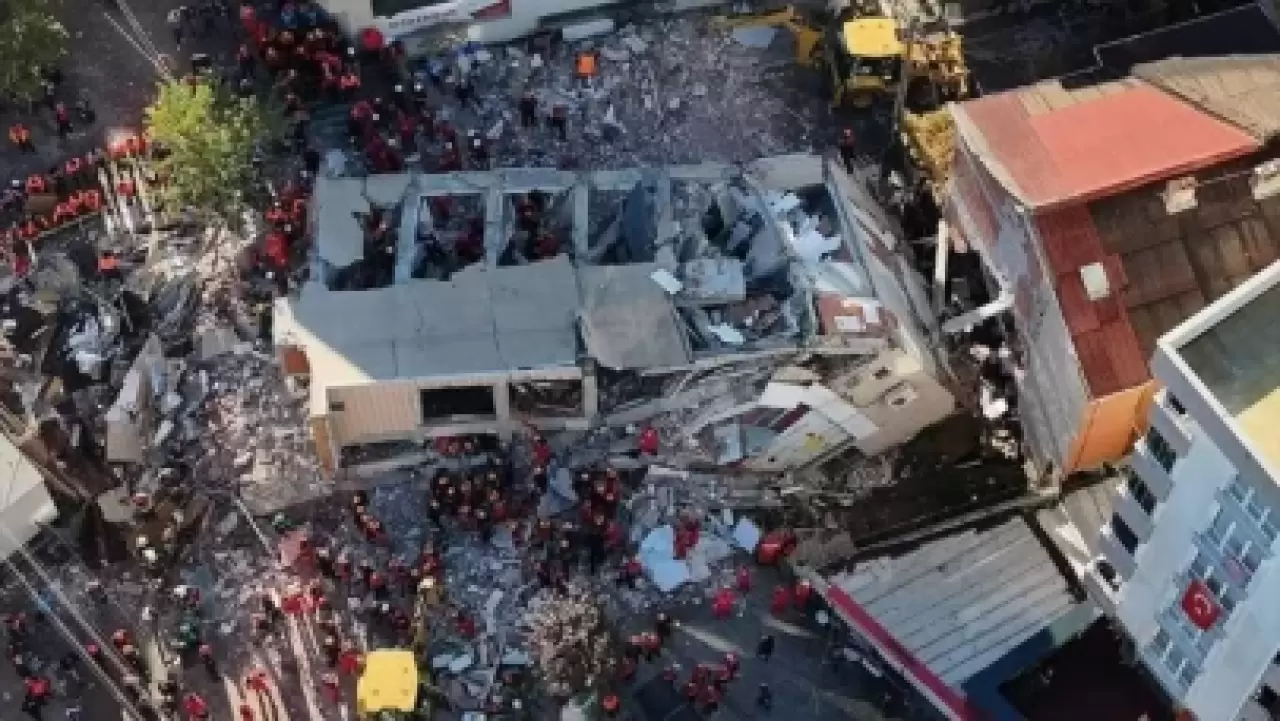 Kocaeli'nin Gebze ilçesinde enkazında 2 çocuğun cansız bedenine ulaşılan binanın yıkılma anı, saniye saniye güvenlik kamerasına yansıdı.
