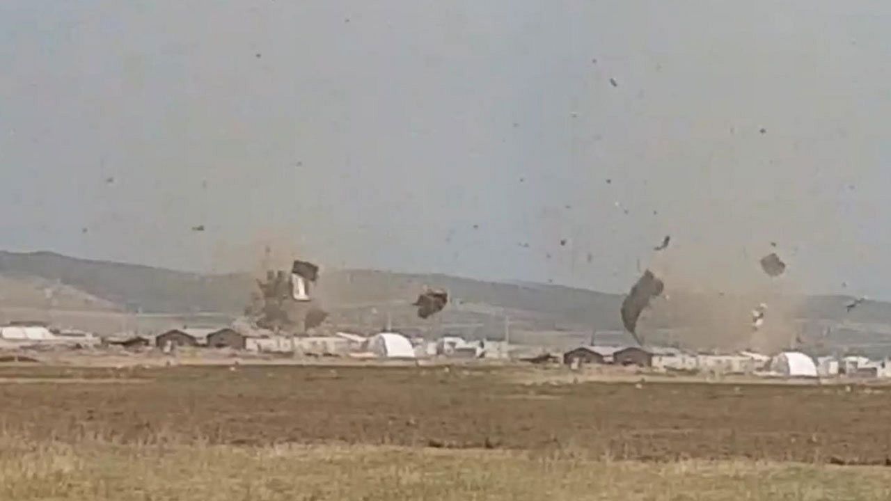 Olayın yaşandığı anlar, çatılardaki sacları savuran hortum cep telefonu ile kaydedildi.
